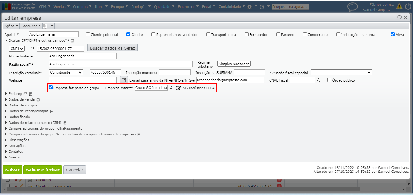 1) Sempre que é cadastrada mais de uma empresa do mesmo grupo, o ideal é que essas empresas tenham a opção “Empresa faz parte do grupo” marcada, apontando para a empresa Matriz.