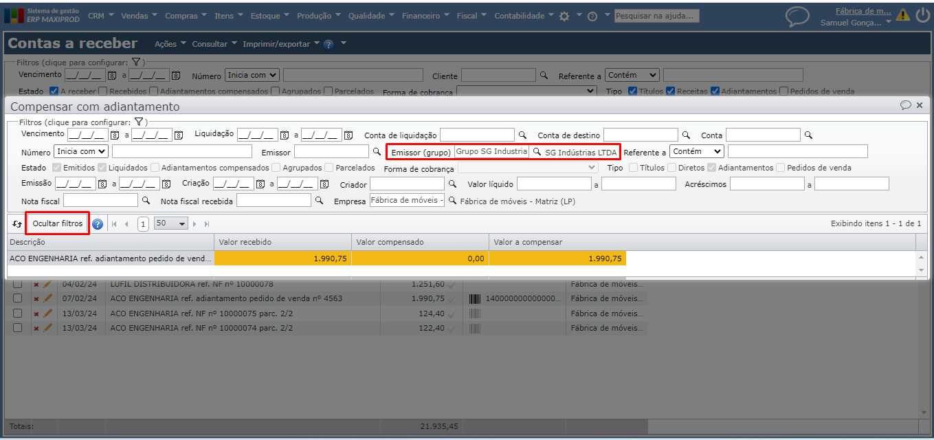 2) A janela de compensação com adiantamento é aberta filtrando pelo “Emissor (grupo)” e não pelo “Emissor”, ou seja, filtrando por todos os adiantamentos das empresas integrantes daquele grupo.