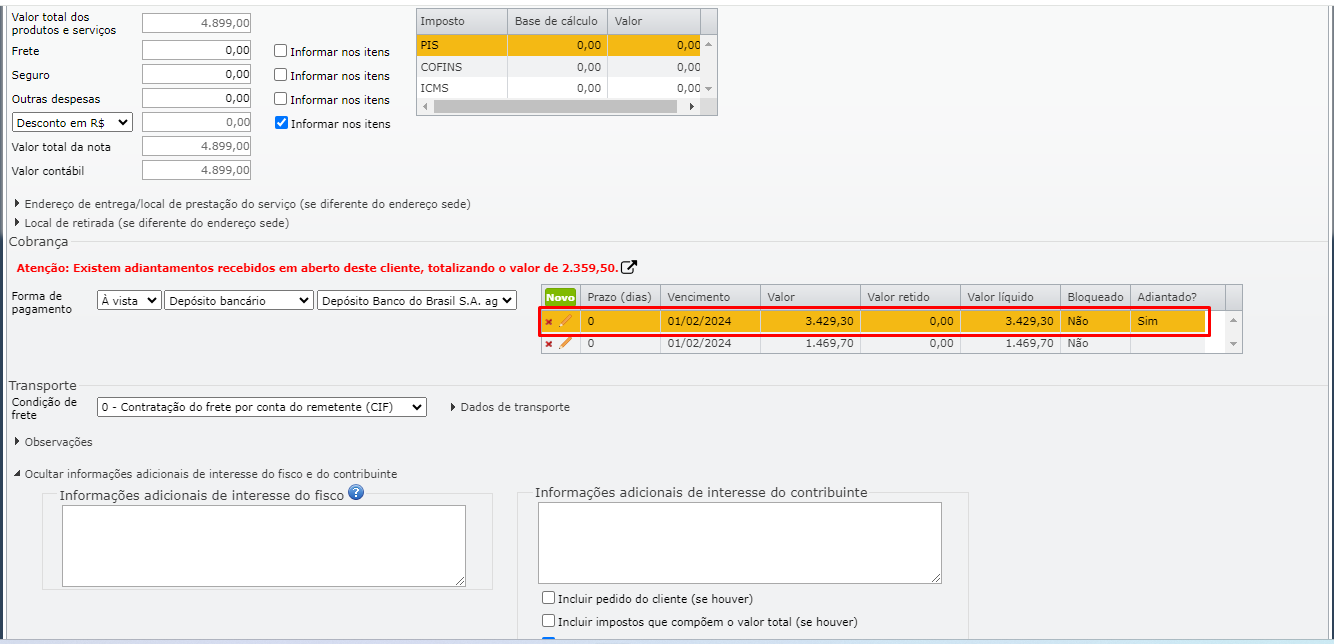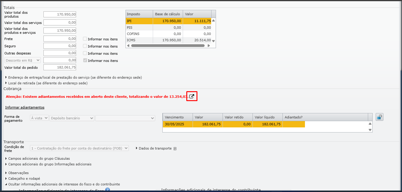 2) Nos pedidos de venda e notas fiscais deste cliente, o alerta é exibido com mais detalhes “Atenção: Existem adiantamentos recebidos em aberto deste cliente, totalizando o valor de 13.254,03.”.