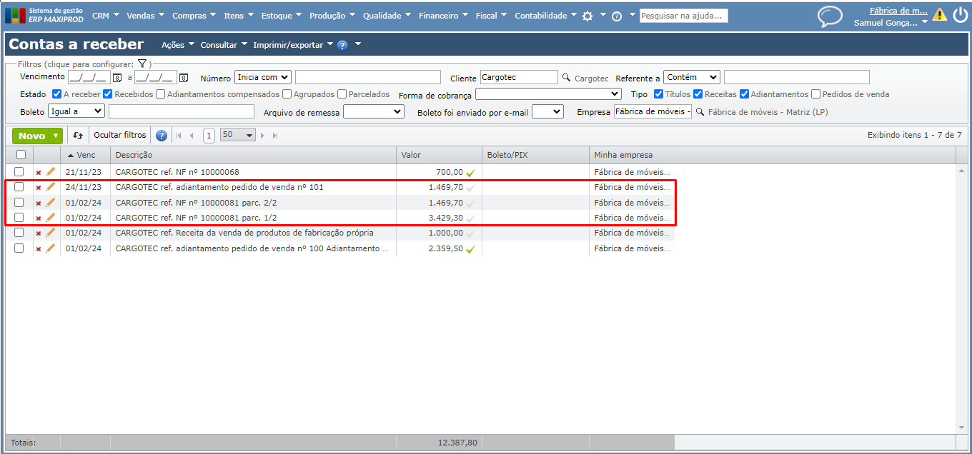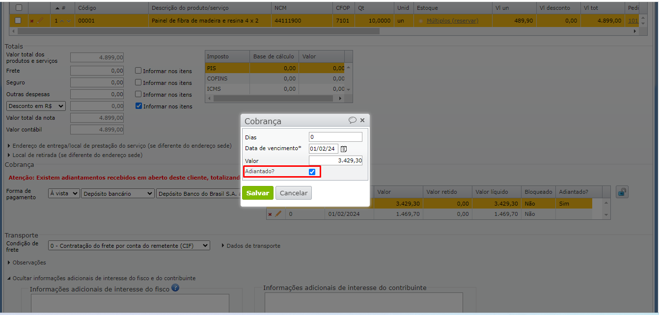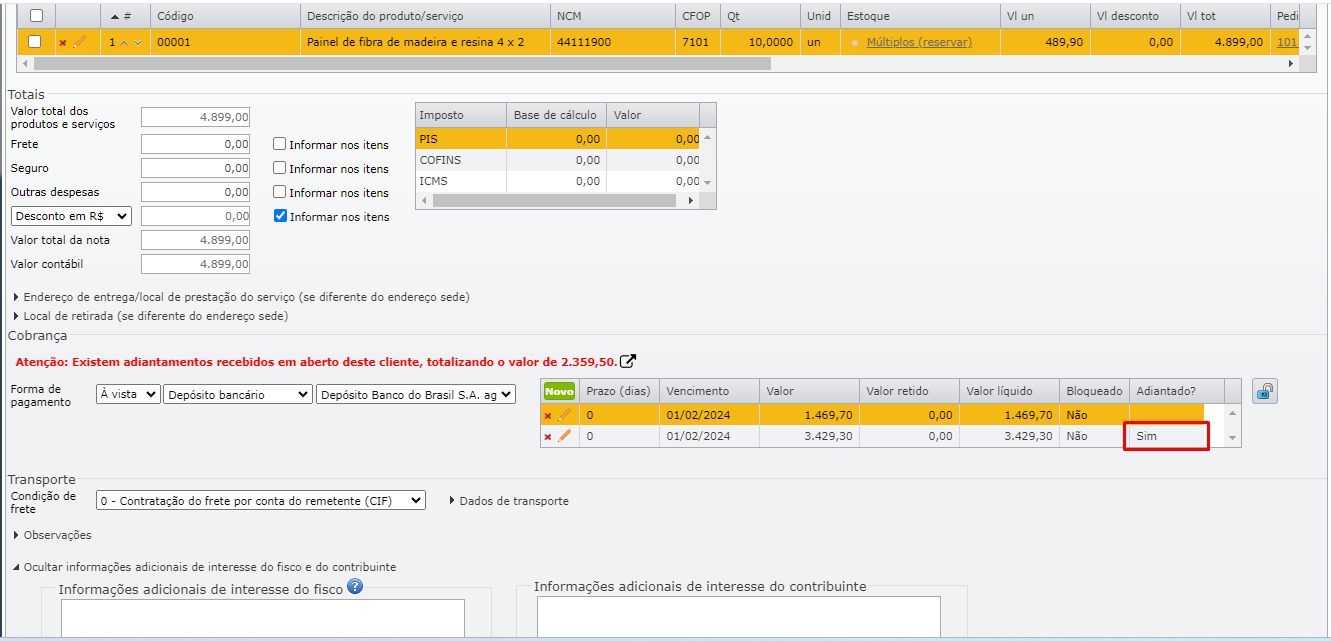 2) Ao faturar ou ao receber o pedido, os adiantamentos são transferidos para a nota fiscal. É gerada uma parcela à parte referente aos adiantamentos, cujo vencimento é a data de emissão da nota, e identificado na coluna “Adiantado?” com a palavra “Sim”.