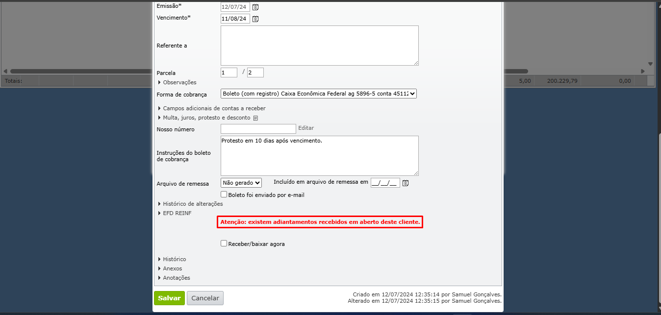 1) No exemplo abaixo, o cliente possui adiantamentos que foram recebidos, mas que não foram utilizados para compensar títulos. Portanto, na edição de um título a receber do cliente, o sistema exibe a seguinte informação “Atenção: existem adiantamentos recebidos em aberto deste cliente.”.