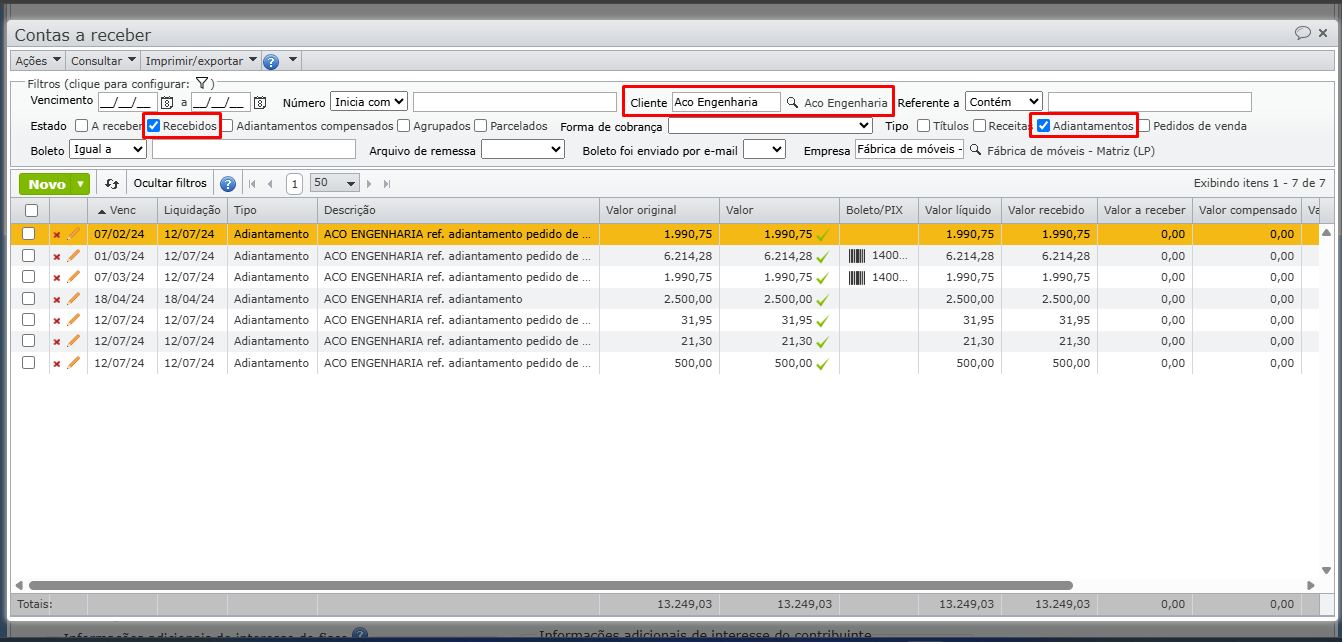 - Como consultar adiantamentos recebidos em aberto do cliente?