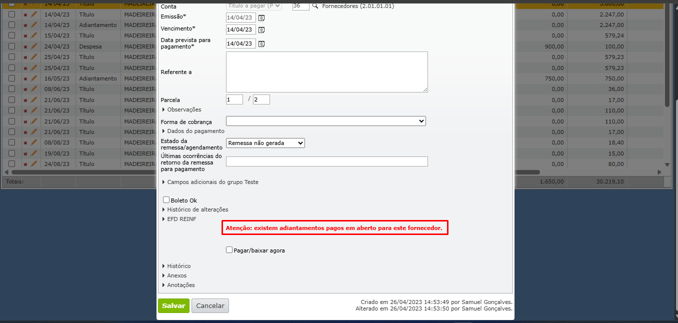 3) No exemplo a seguir, o fornecedor possui adiantamentos que foram pagos, mas que não foram utilizados para compensar títulos. Portanto, na edição de um título a pagar do fornecedor, o sistema exibe a seguinte informação “Atenção: existem adiantamentos pagos em aberto para este fornecedor.”.