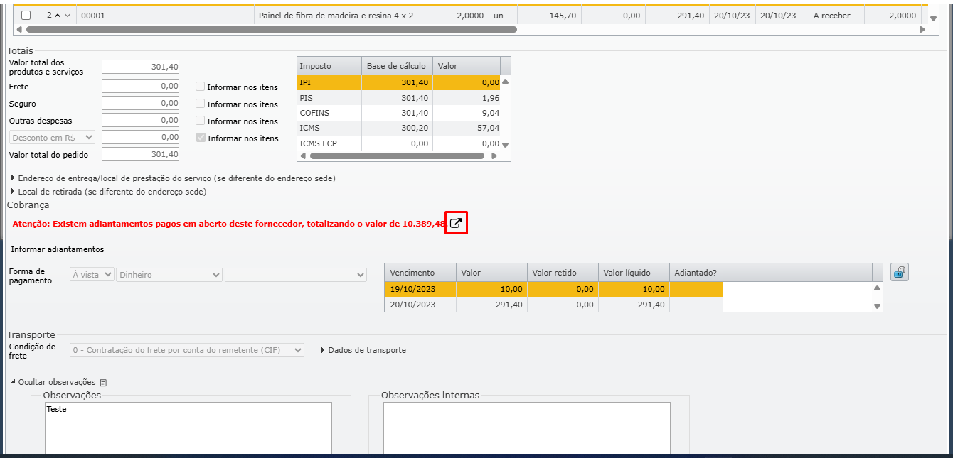 4) Nos pedidos de venda e notas fiscais deste fornecedor, o alerta é exibido com mais detalhes “Atenção: Existem adiantamentos pagos em aberto deste fornecedor, totalizando o valor de 10.389,48.”.