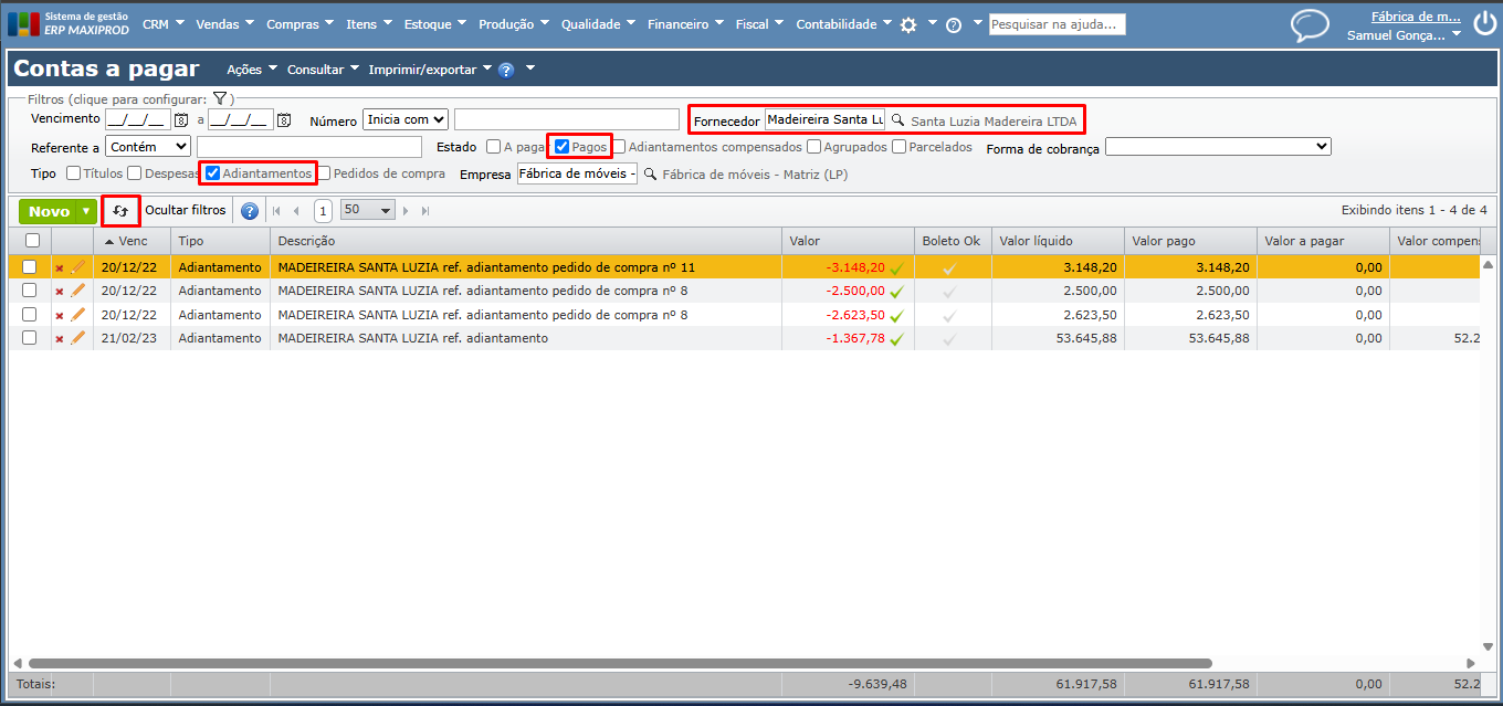 2) Na tela de contas a pagar, filtre por “Fornecedor”, estado “Pagos” e tipo “Adiantamentos”. Ao atualizar a grade clicando no botão “Atualizar” ao lado direito do botão verde “Novo”, somente adiantamentos pagos e em aberto serão carregados na grade.