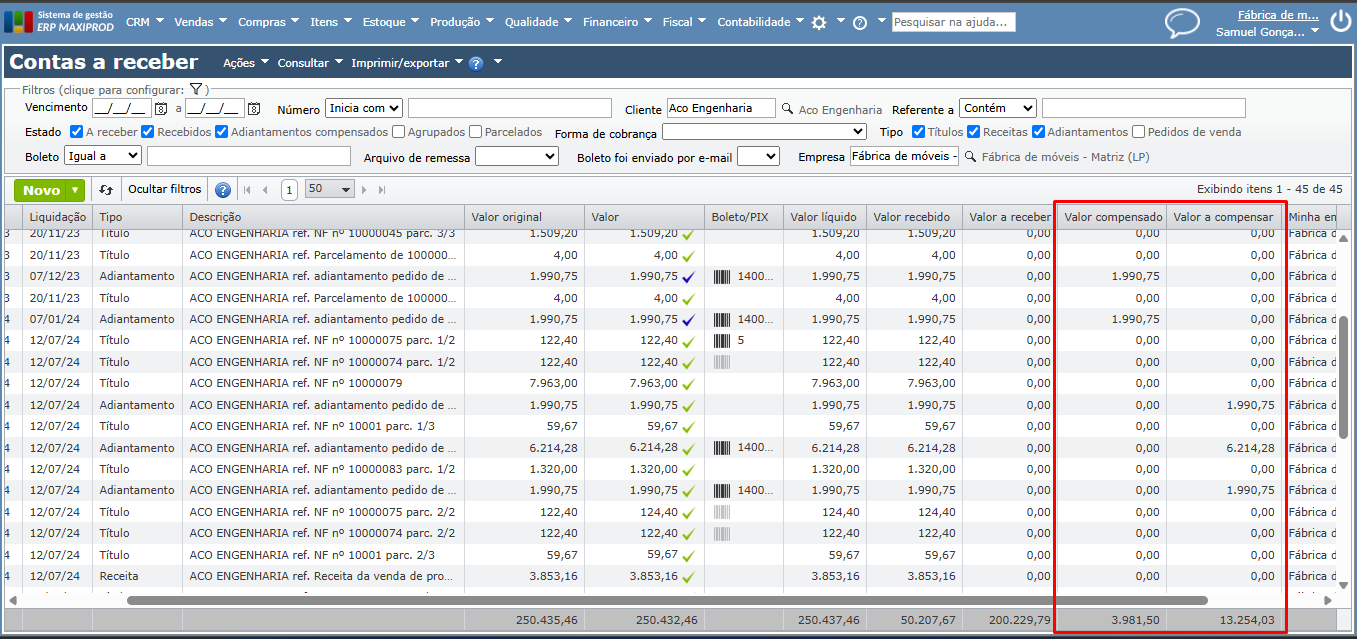 1) Nas telas de contas a receber ou contas a pagar, as colunas “Valor compensado” e “Valor a compensar” somente exibem valores para contas a receber/pagar do tipo “Adiantamento”. Servem justamente para indicar o valor daquele adiantamento já utilizado em compensação de títulos, e o valor que ainda resta para compensar títulos.