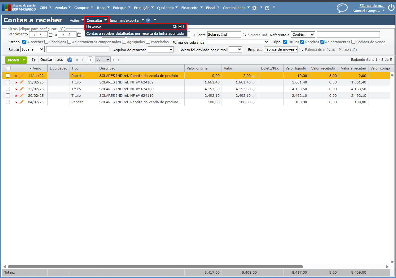 1) Na grade de títulos, localize o título que foi compensado com adiantamento, ou o próprio adiantamento que compensou o título, selecione-o e, acesse “Consultar > Histórico”.