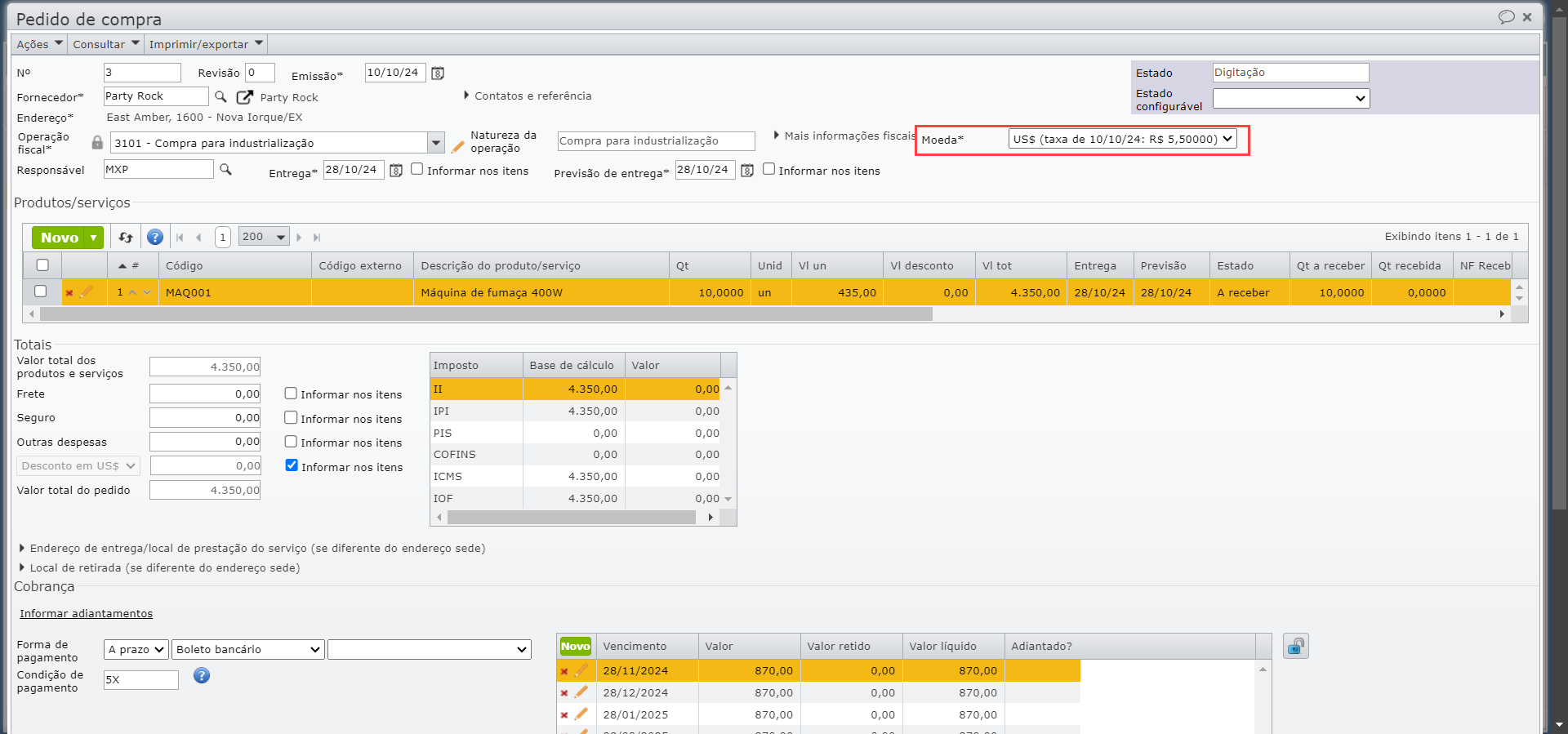 2) Informe a moeda estrangeira no pedido. Para saber como cadastrar moedas estrangeiras, clique aqui.