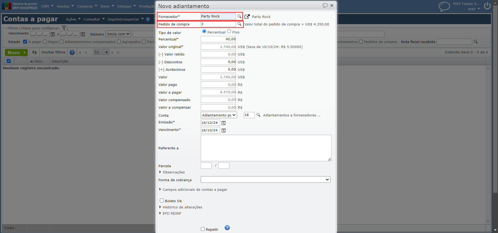 Este tópico mostra como lançar adiantamentos manualmente, ou seja, pela tela de contas a pagar, vinculando manualmente com o pedido em moeda estrangeira. No entanto, o adiantamento pode ser lançado diretamente pelo pedido de compra. Para saber mais, clique aqui.