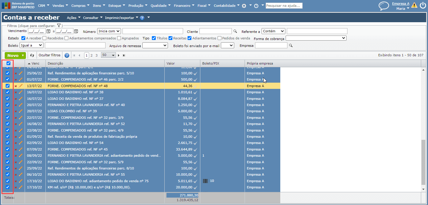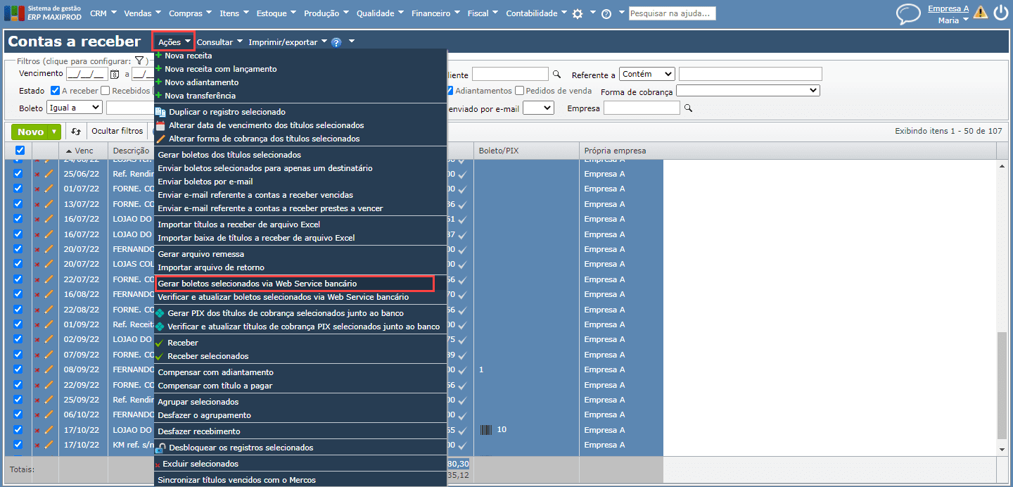 1) No menu“Financeiro > Contas a Receber”, selecione os títulos desejados para a geração dos boletos via web service.