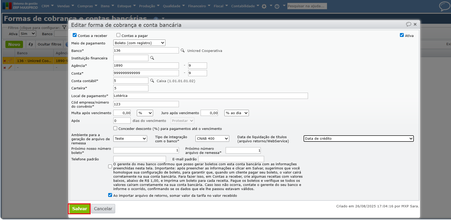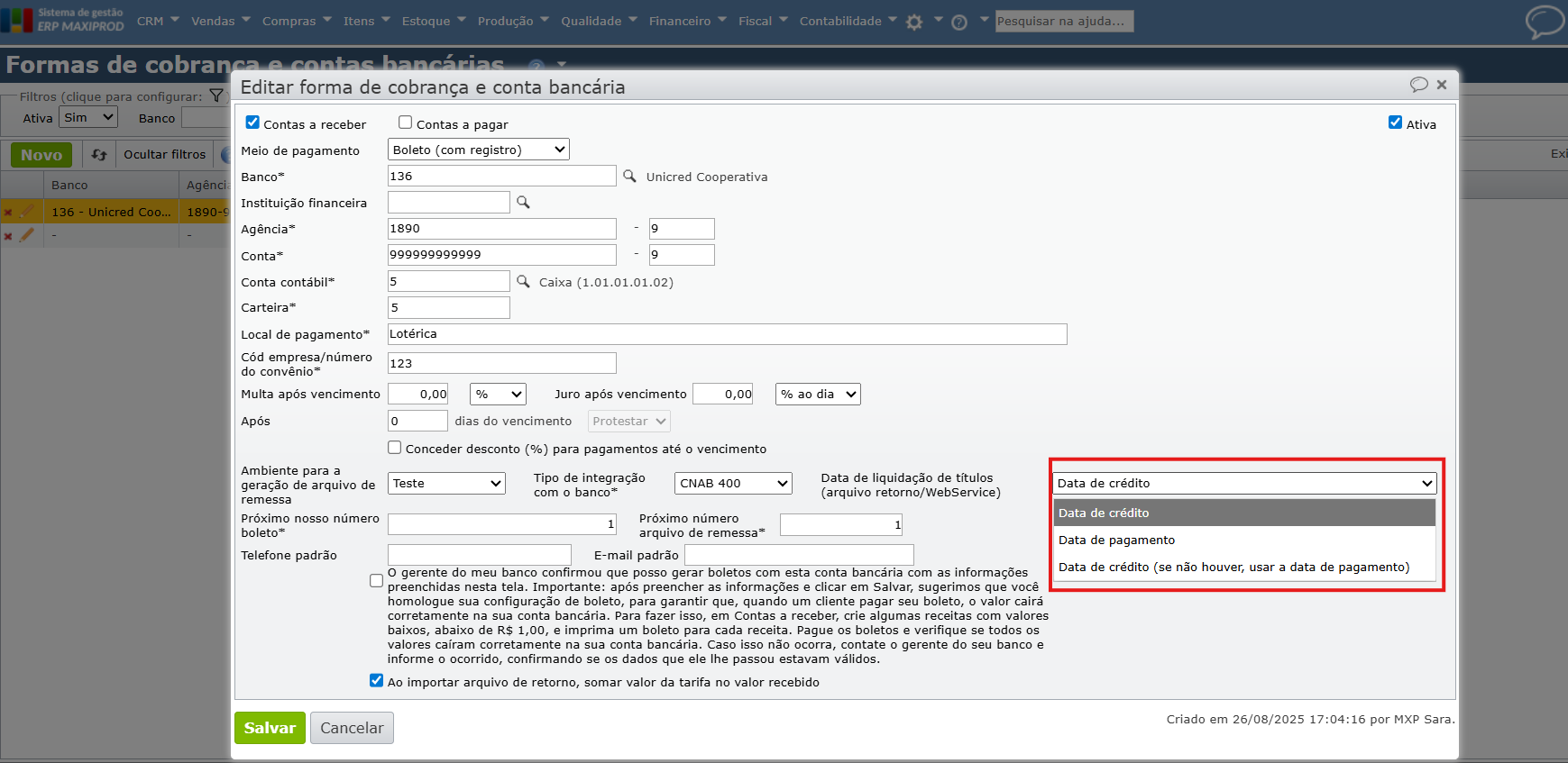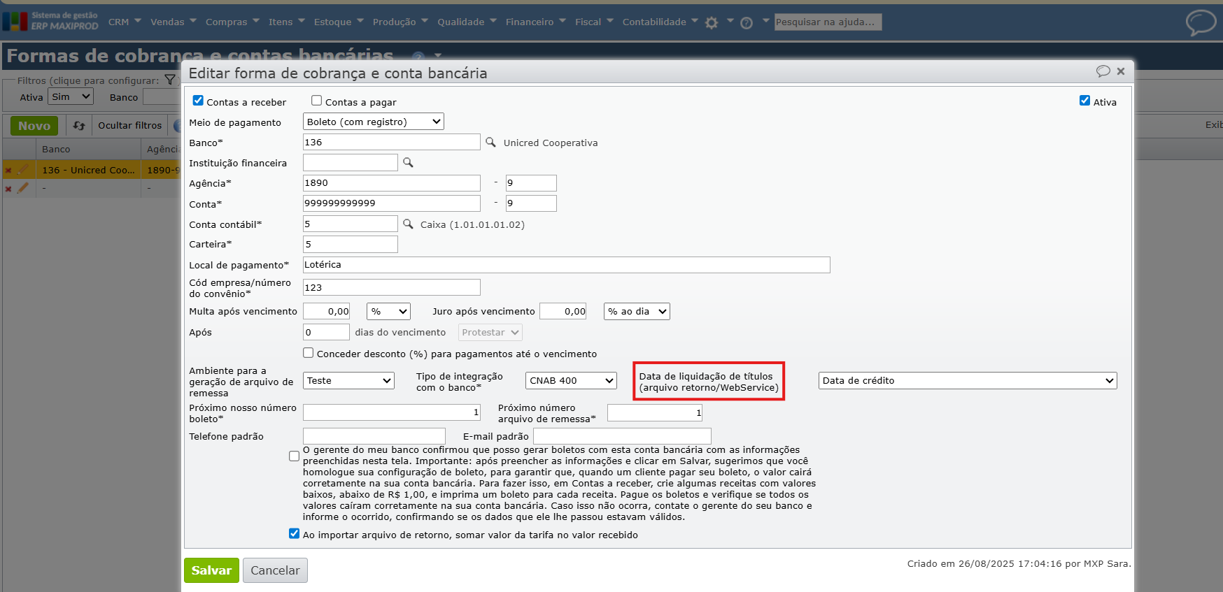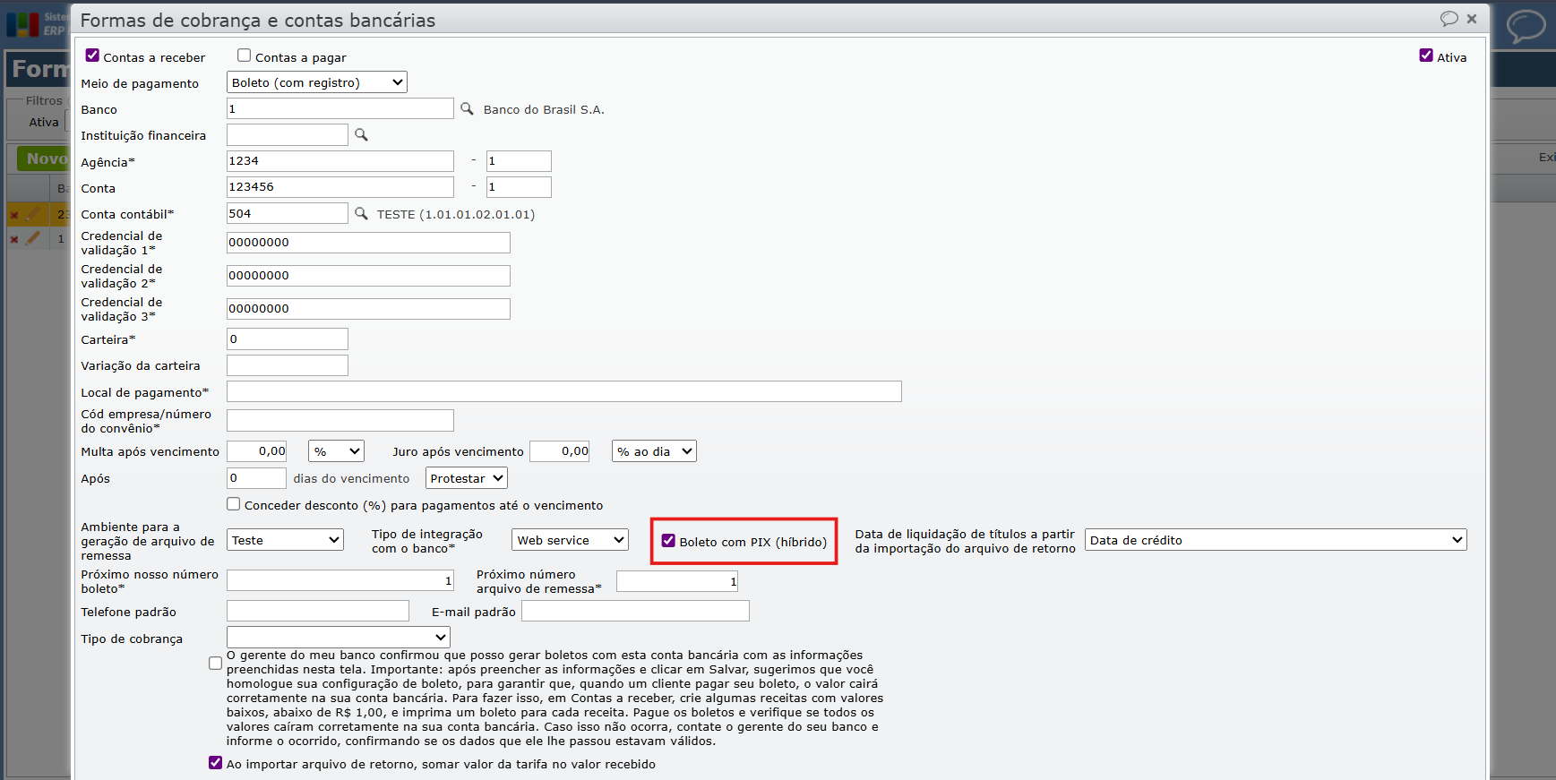 Após a conclusão da configuração da forma de cobrança bancária com o tipo de integração “web service”, é preciso informar essa forma de cobrança nos títulos a receber: