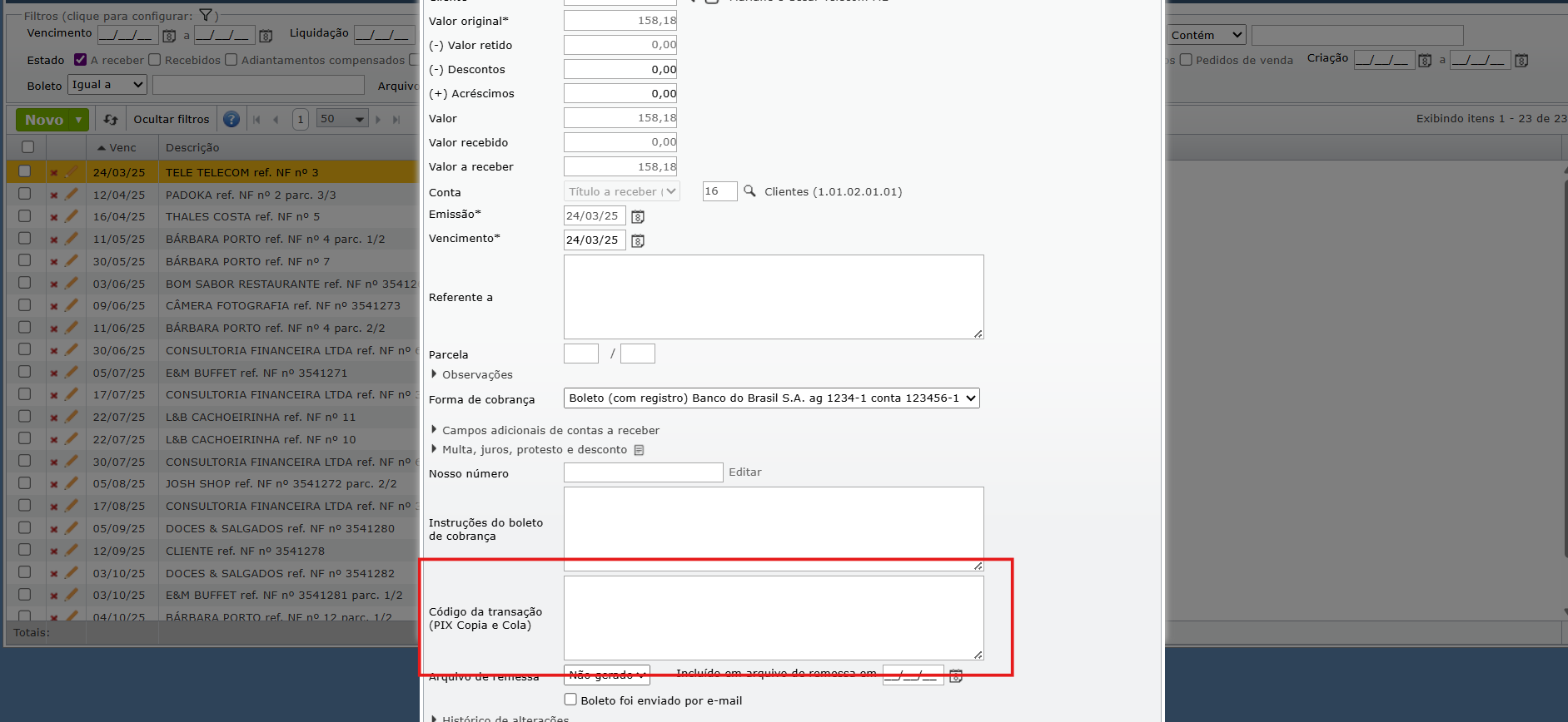 3) Na tela de edição de contas a receber, é exibido o campo “Código da transação (PIX Copia e Cola)”.