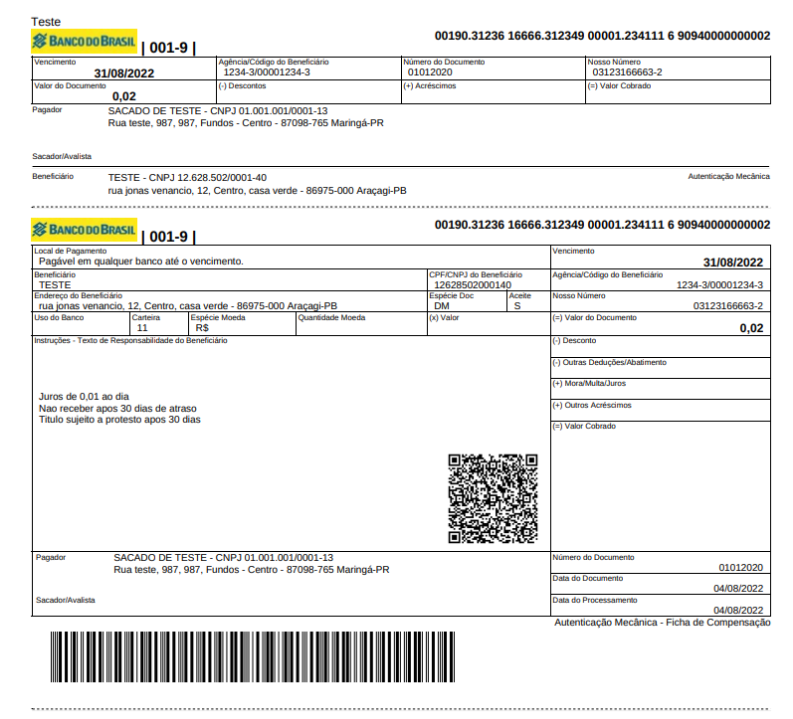 4) Em caso de sucesso, o boleto já estará disponível para pagamento, sendo gerado seu arquivo PDF:
