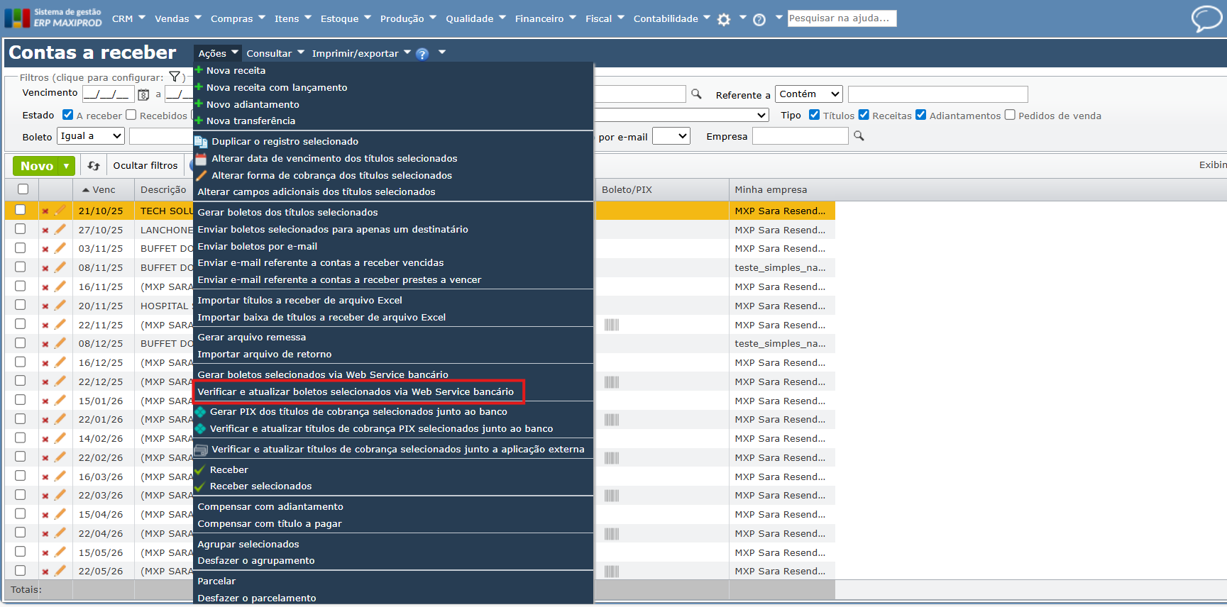 2) Ao clicar neste menu, se o boleto selecionado foi gerado via web service e está registrado no banco, é verificado se está no estado “LIQUIDADO”. Neste caso, é efetuada a baixa do título a receber no ERP MAXIPROD, com base no valor baixado informado pelo banco.