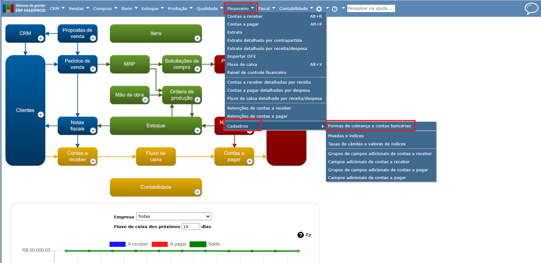 1) Acesse o menu “Financeiro > Cadastros > Formas de cobrança e contas bancárias”.