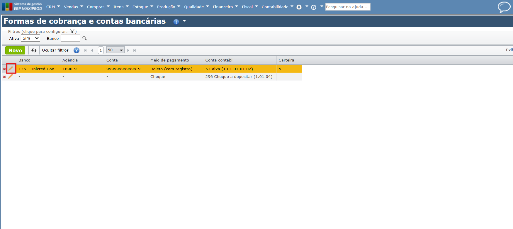2) Na tela “Formas de cobrança e contas bancárias”, clique no ícone do lápis