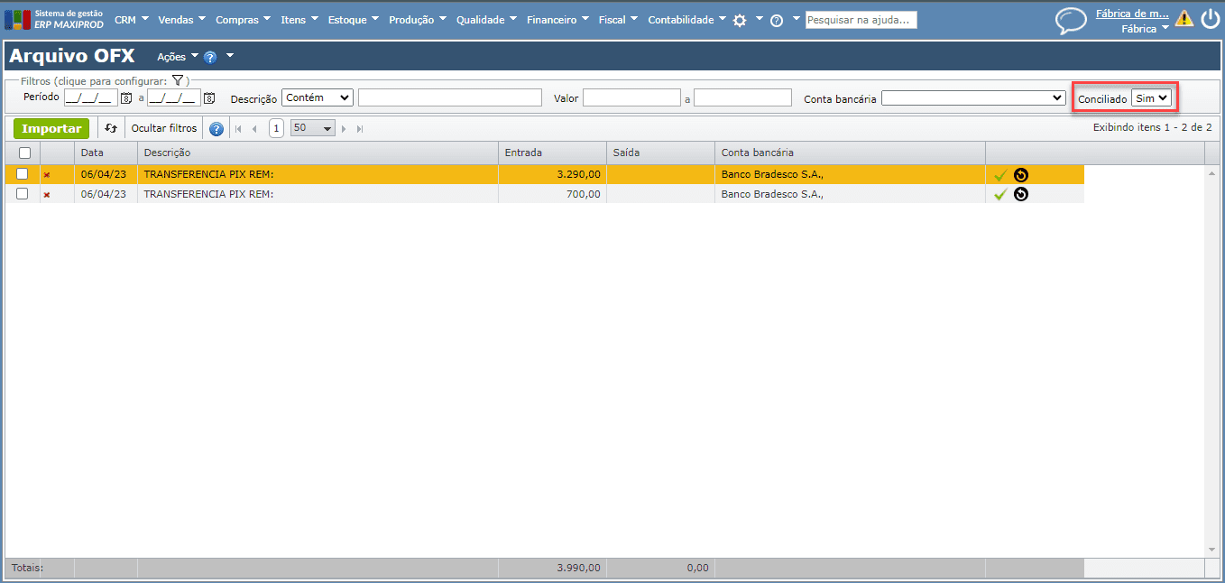 2) Altere o filtro “Conciliado” para “Sim”, para serem exibidos os registros que já foram conciliados.