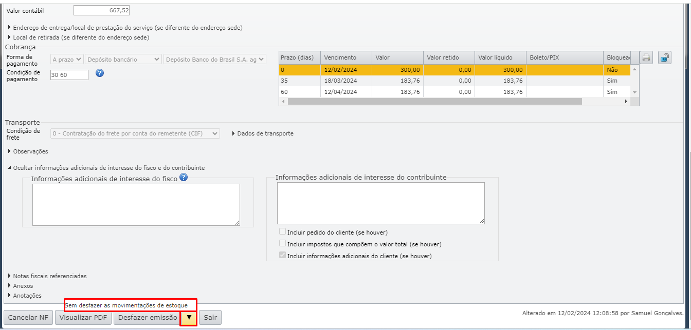 b) Se o usuário pretende apenas alterar a condição de pagamento, pode optar por “Desfazer emissão – sem desfazer as movimentações de estoque”.