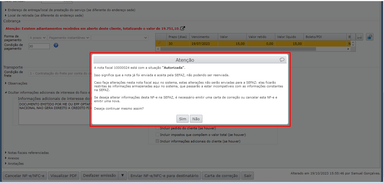 a) A ação de desfazer emissão não altera o que foi transmitido para a SEFAZ, tem reflexos apenas ao nível de sistema, como movimentações de estoque e contas a receber/pagar no financeiro, e os lançamentos contábeis. Ao clicar em “Desfazer emissão” de NF autorizada na SEFAZ, o sistema apresenta a seguinte mensagem: