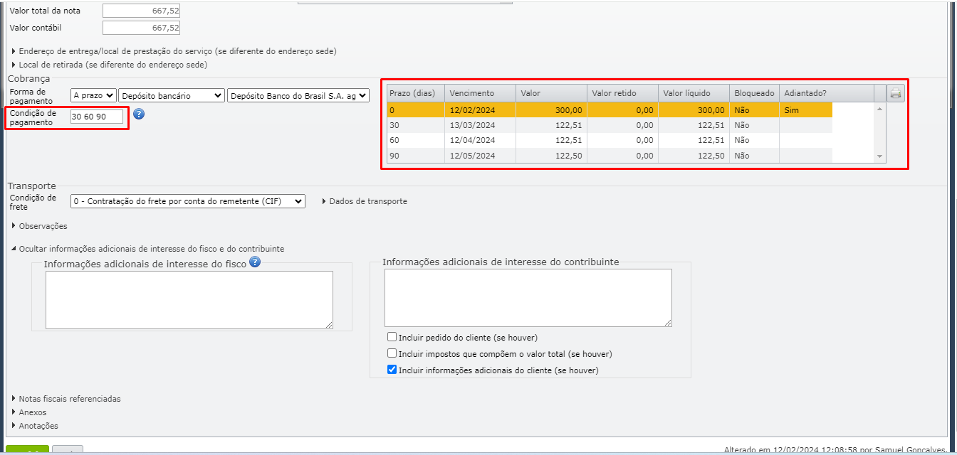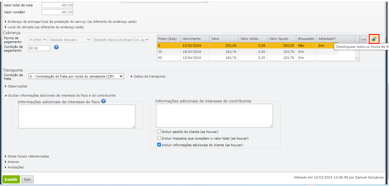 3) Com os títulos desbloqueados, altere o valor do campo “Condição de pagamento” conforme os valores aceitos. Verifique os títulos gerados na grade de cobrança e em seguida, clique novamente no botão verde “Emitir” para emitir a NF-e.