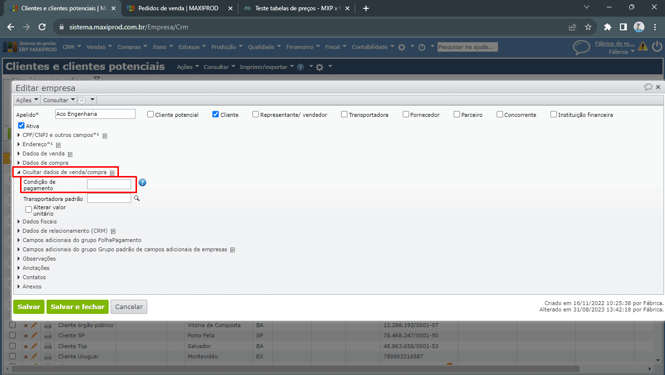 Para definir a condição de pagamento padrão de uma empresa cliente ou fornecedora, acesse o cadastro da empresa e preencha o campo “Condição de pagamento” da seção “Dados de venda/compra”.