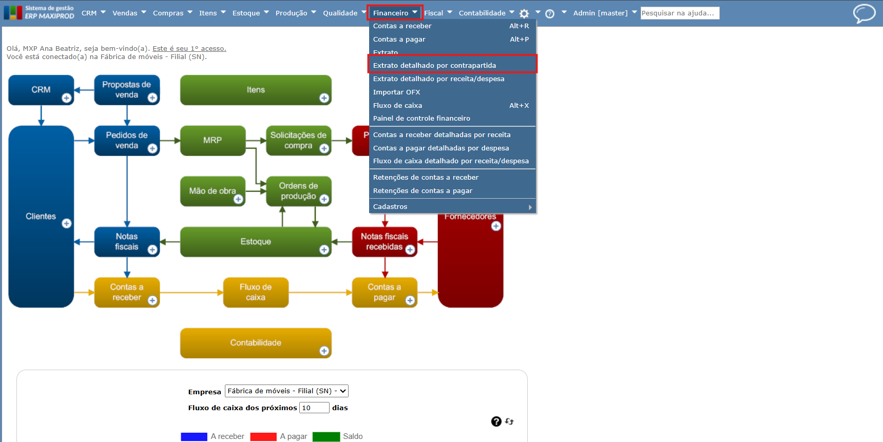 1) Vamos no menu “Financeiro > Extrato detalhado por contrapartida”.