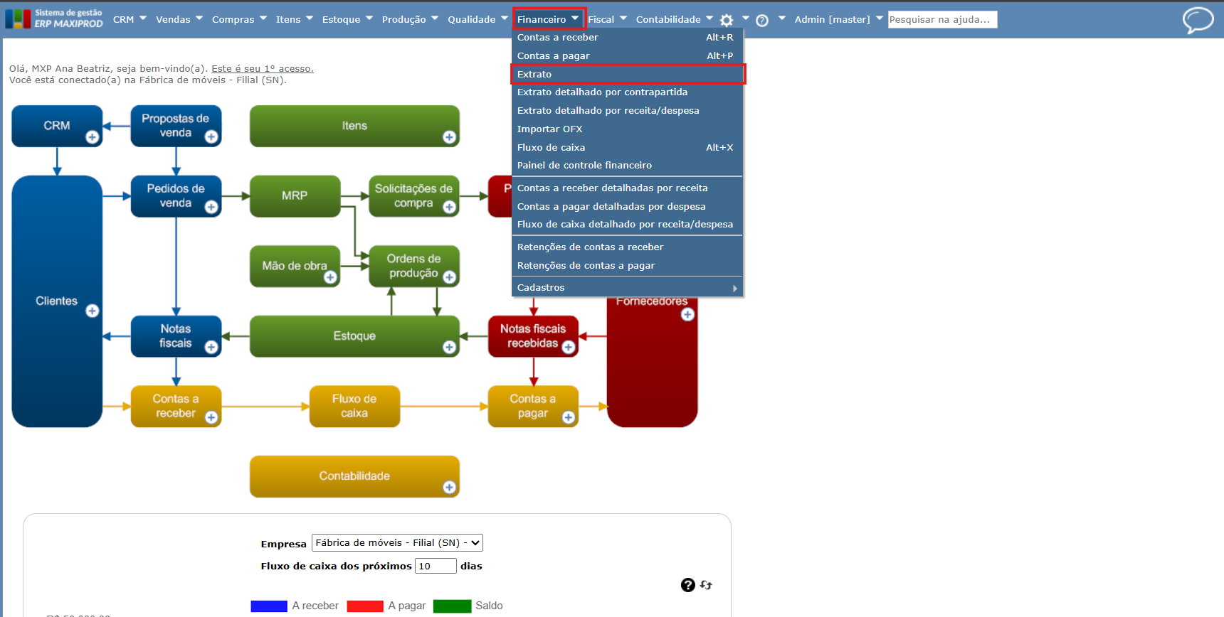 1) Para acessar a tela de “Extrato”, vá no menu “Financeiro > Extrato”: