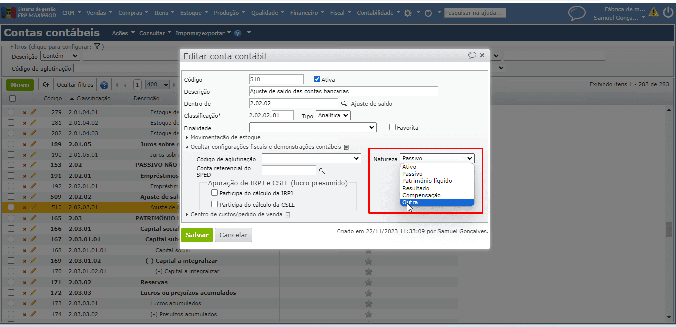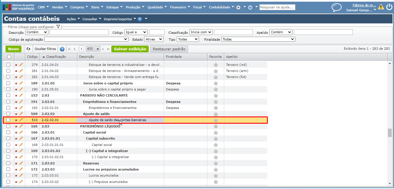a) Verifique internamente com a contabilidade, ou com alguém de notório conhecimento sobre o assunto, em que classificação (conta pai) deve ser criada a conta contábil de ajuste do saldo.