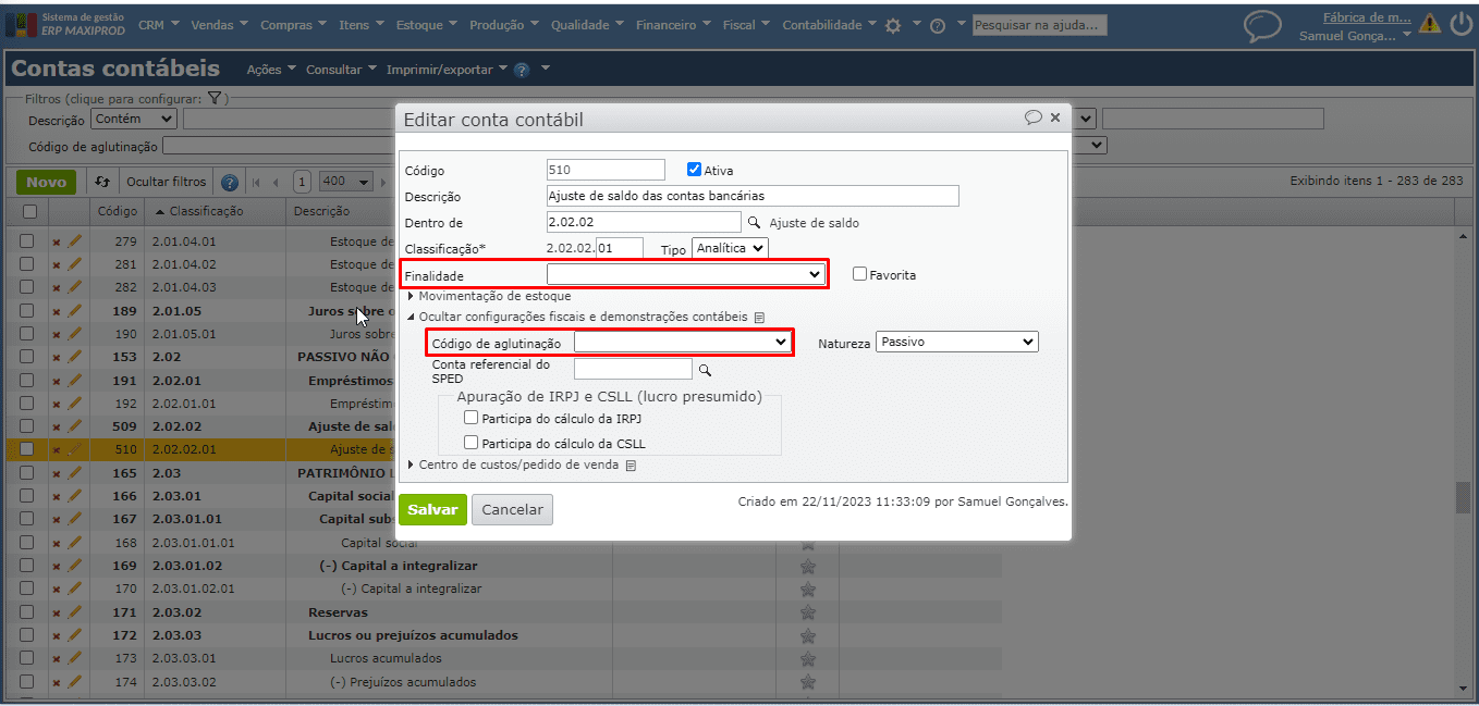 b) A conta contábil para ajuste de saldo deve ter o campo “Finalidade” vazio. Certifique-se de que o campo “Código de aglutinação” também não seja preenchido, para que o saldo desta conta não seja contabilizado nas demonstrações contábeis (DRE, balanço patrimonial, etc.)