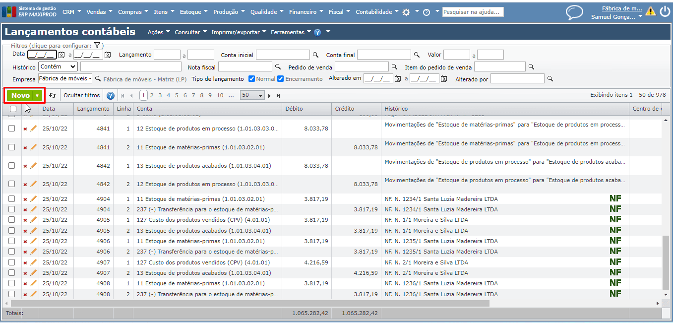 a) Na tela de lançamentos contábeis, clique no botão verde “Novo” para abrir a janela de inserção do novo lançamento.