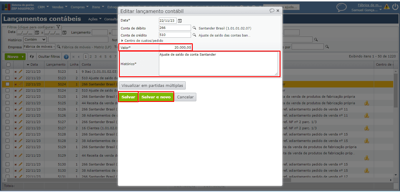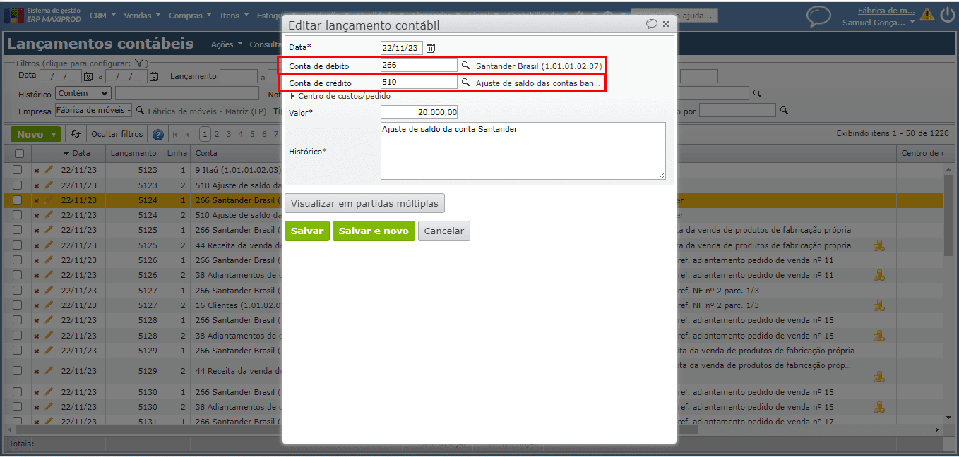 - a conta do Banco Santander mostra um saldo de R$ 70 mil no sistema, mas o saldo real é R$ 90 mil. Neste caso, o usuário precisa fazer um lançamento contábil creditando 20 mil na conta contábil de ajuste de saldo bancário e debitando este valor na conta do Banco Santander.