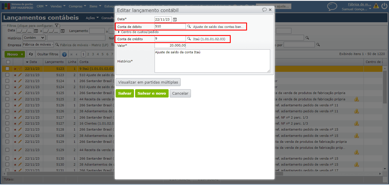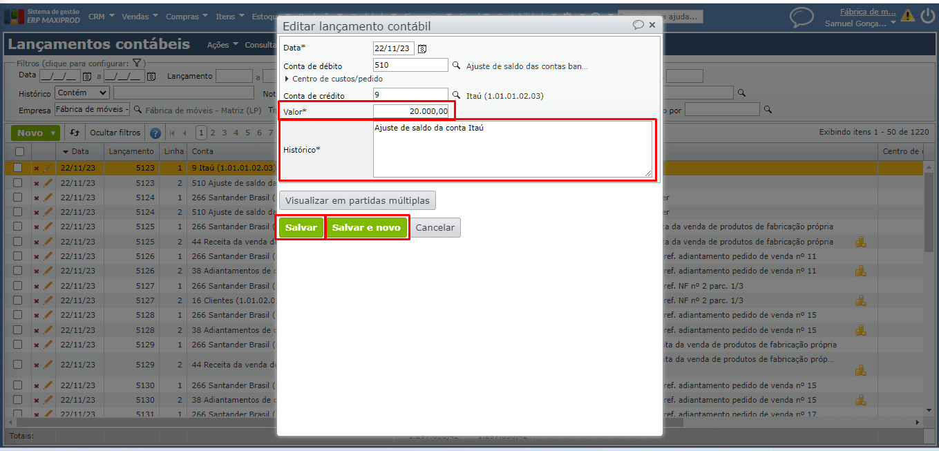 - a conta do Banco Itaú mostra um saldo de R$ 50 mil no sistema, mas o saldo real é R$ 30 mil. Para ajustar, o usuário precisa fazer um lançamento contábil creditando 20 mil na conta Banco Itaú, e debitando em alguma conta contábil de ajuste de saldo bancário.