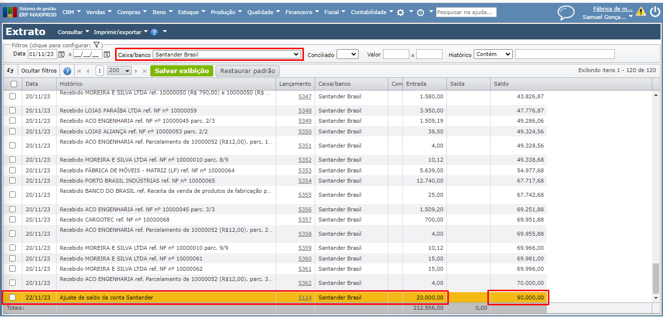 4) Depois de fazer o lançamento contábil de ajuste, acesse o menu superior “Financeiro > Extrato” e filtre pela conta bancária ajustada. Verifique o saldo final.