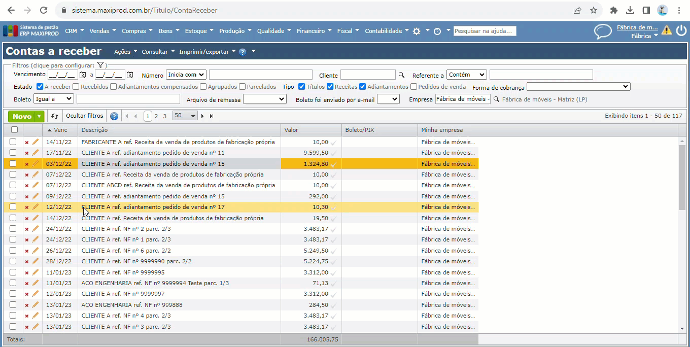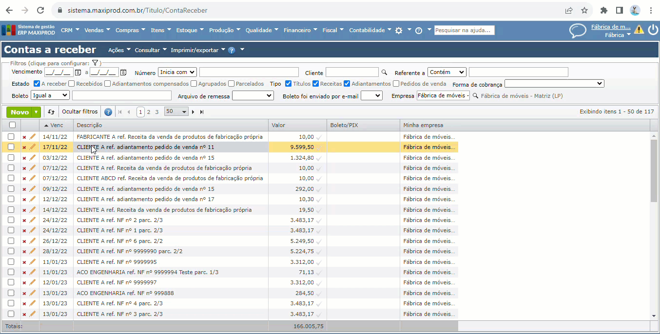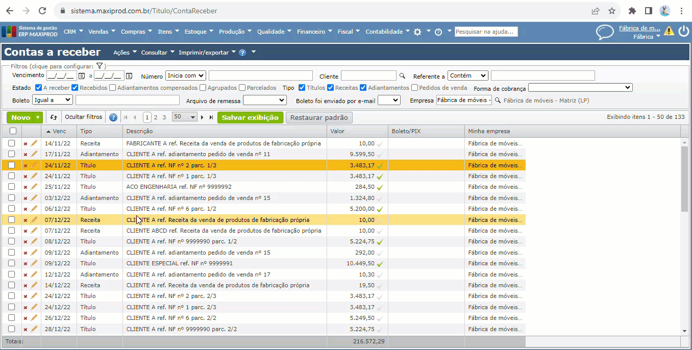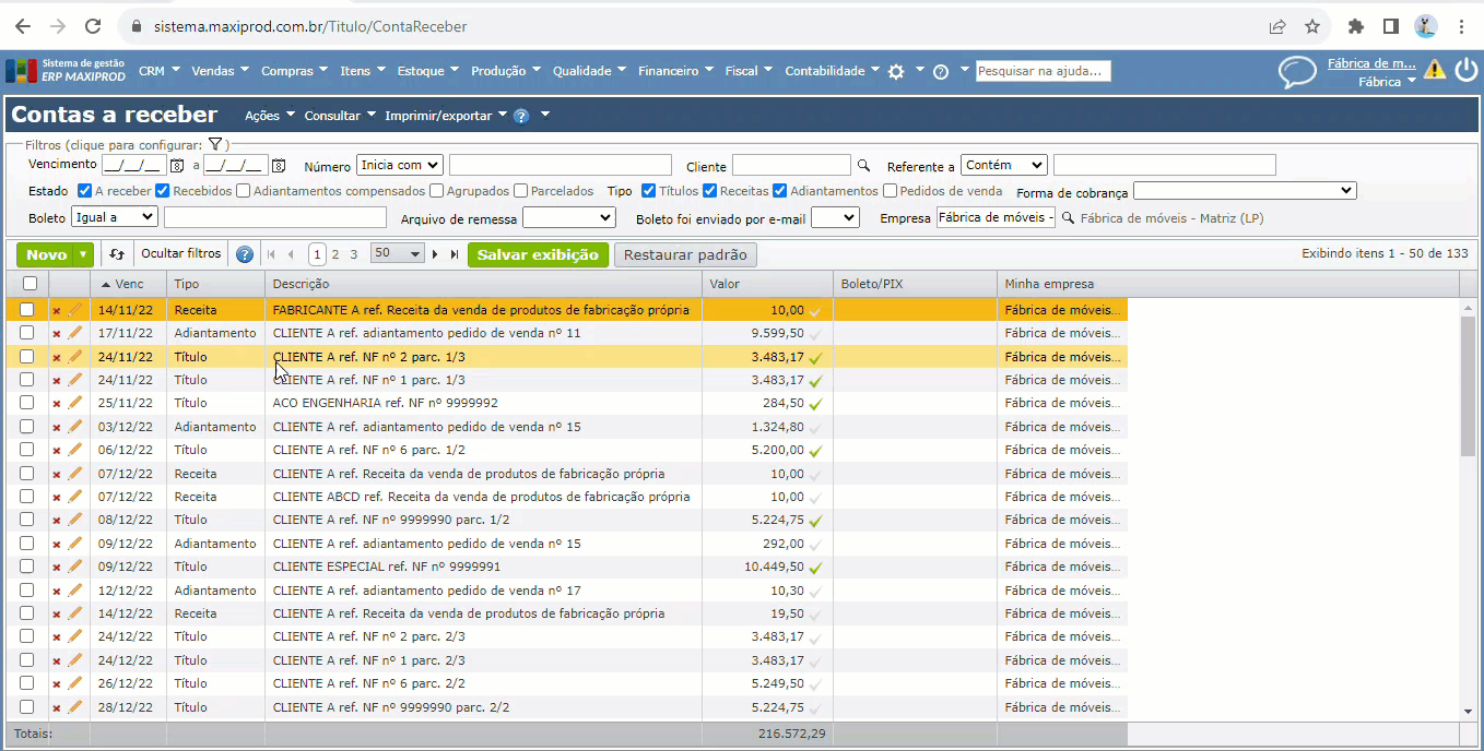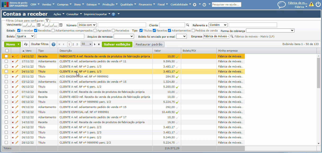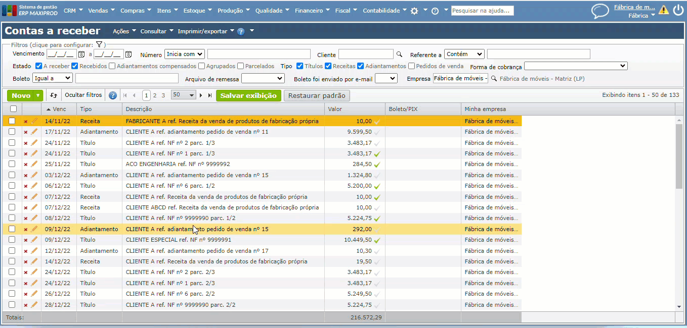 e) Despesa/Receita/Adiantamento: estes tipos são contas a receber/pagar criadas manualmente, seja através do botão verde “Novo” das telas de contas a receber/pagar, ou importando de Excel, por meio de pedido de venda/compra ou pelo menu “Ações” destas telas.