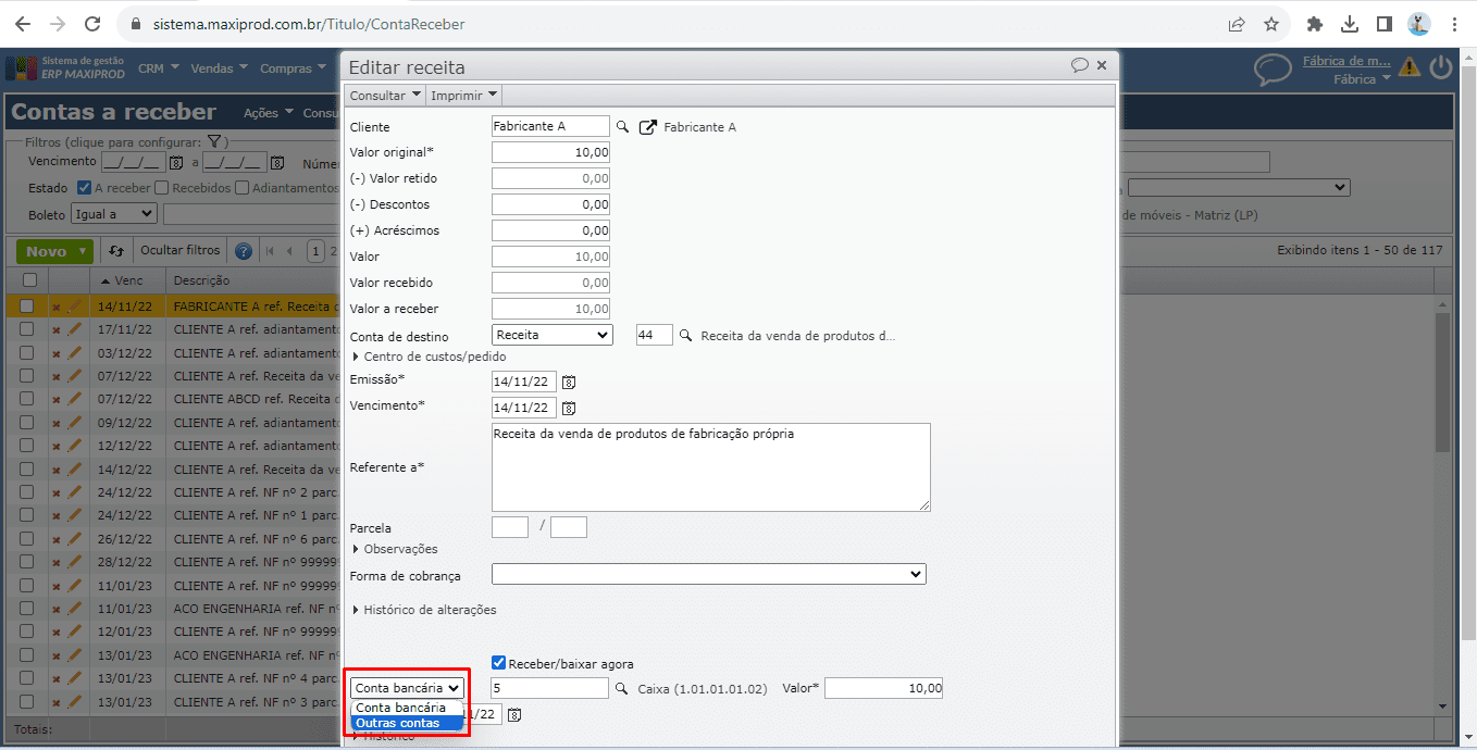 c) Para os títulos que não tiverem a forma de cobrança preenchida, ao clicar em “Receber/pagar (Baixar agora)” o sistema inicializará a conta contábil favorita da finalidade “Caixa/Banco (Ativo)”.