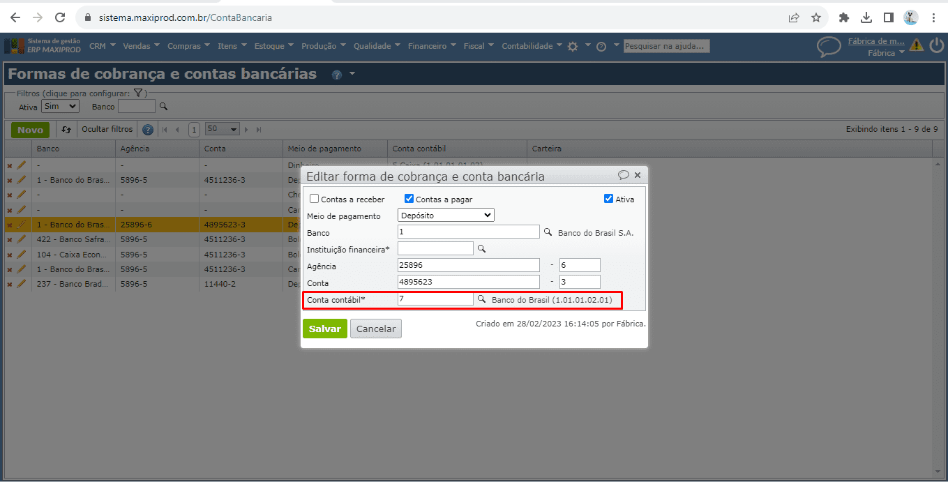 a) Em “Financeiro > Cadastros > Formas de cobrança e contas bancárias” o usuário cadastrou a forma de cobrança “Depósito – Banco do Brasil” e informou a conta contábil (7 – Banco do Brasil).