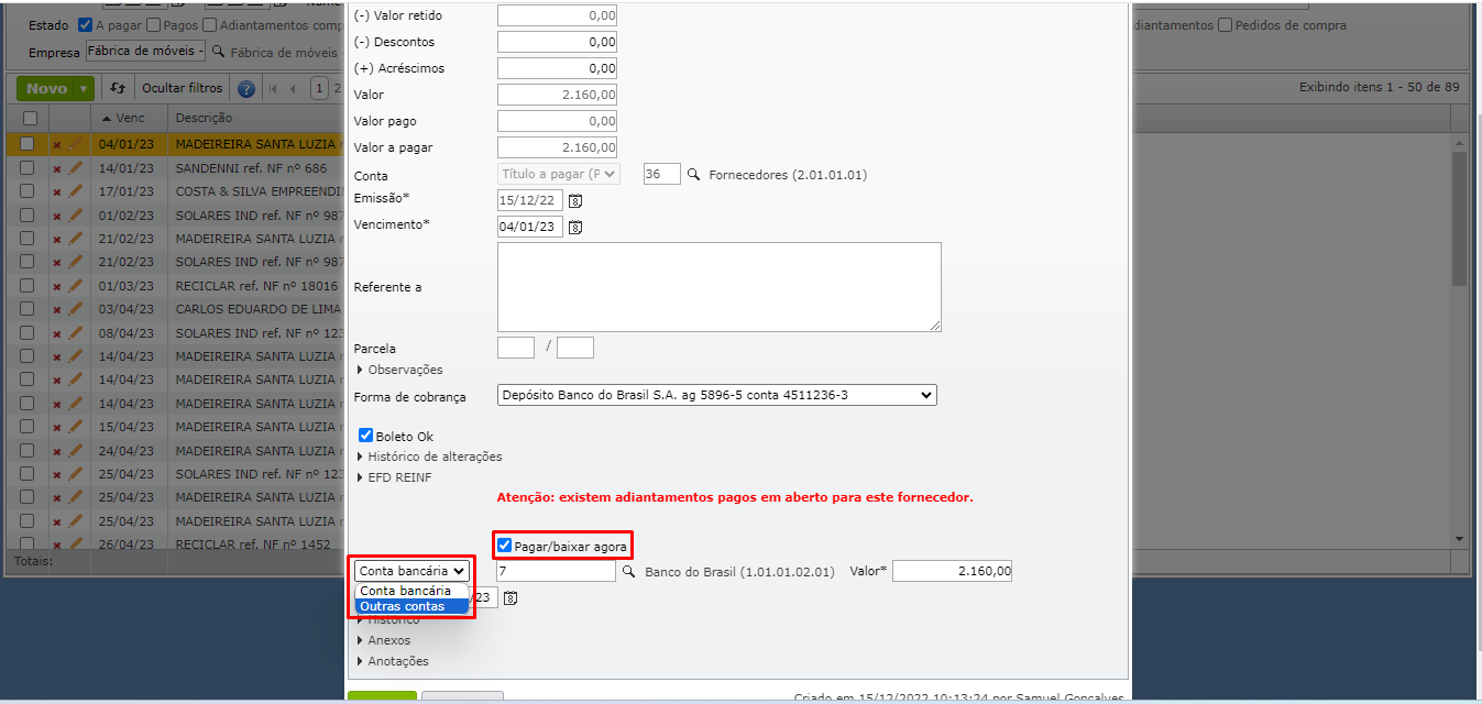 b) Para os títulos com esta forma de cobrança informada, ao clicar no botão “Receber/pagar (Baixar agora)” o sistema carregará a conta (7 – Banco do Brasil) como conta de liquidação.