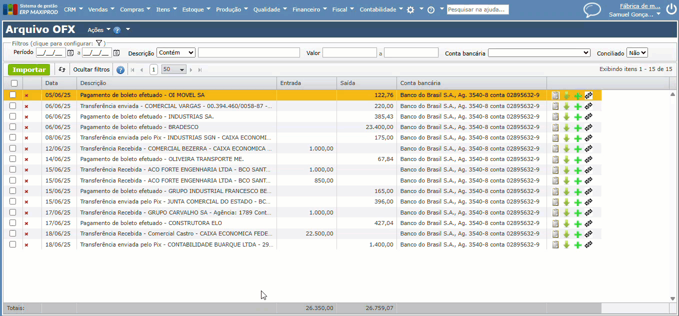 - Como realizar as baixas parciais necessárias para conciliar com os registros do arquivo OFX?