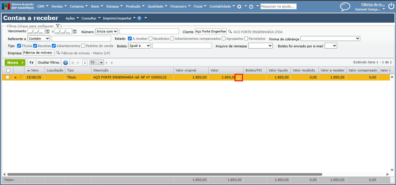 - Um cliente possui um título em aberto no valor de R$ 1.850,00.