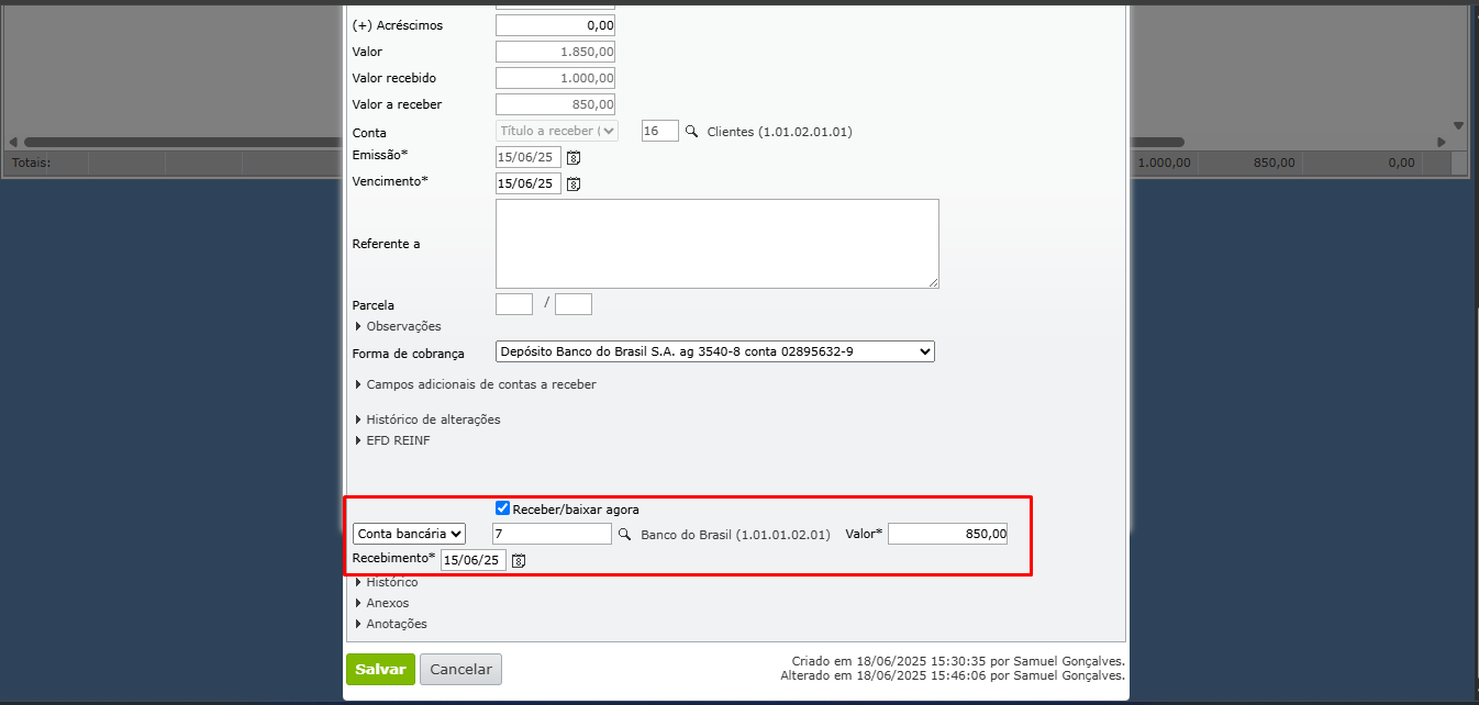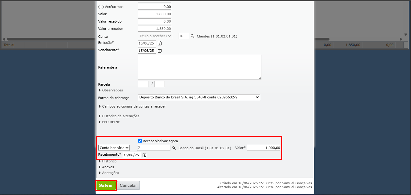 7) Efetue a segunda baixa conforme o valor do registro correspondente no arquivo OFX. Clique no botão verde “Salvar” para efetivar a operação.