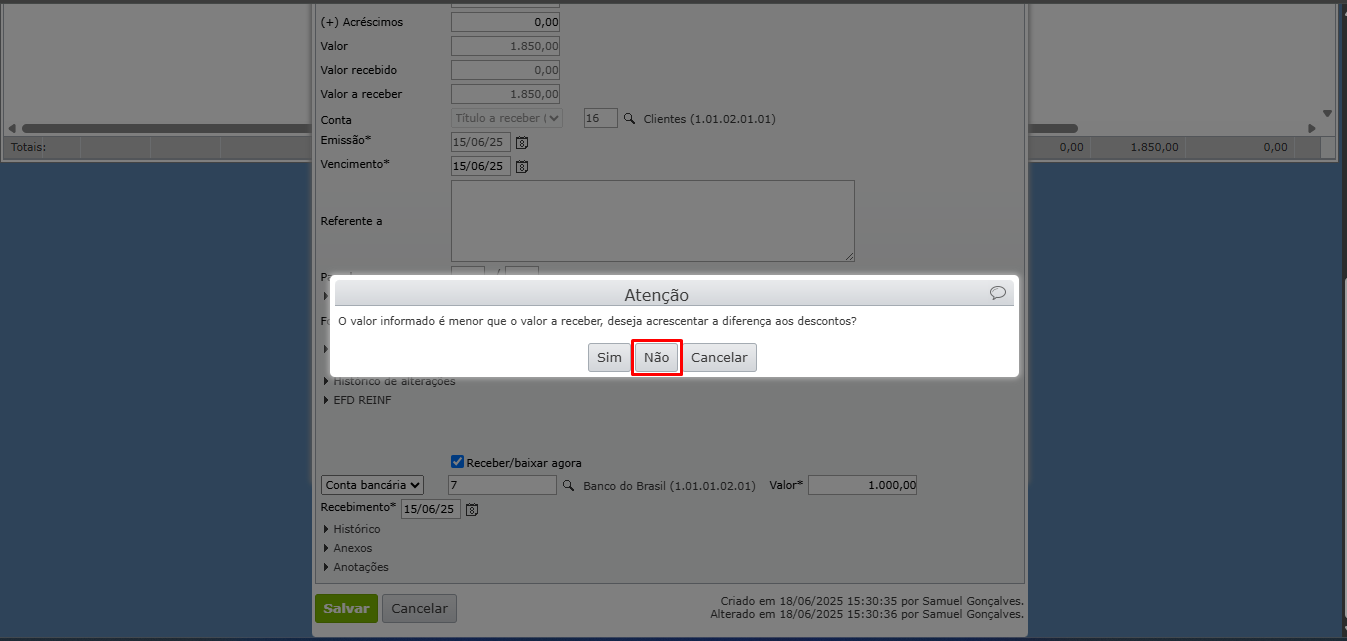5) Será apresentada a seguinte mensagem “O valor informado é menor que o valor a receber, deseja acrescentar a diferença aos descontos?”. Clique em “Não”.