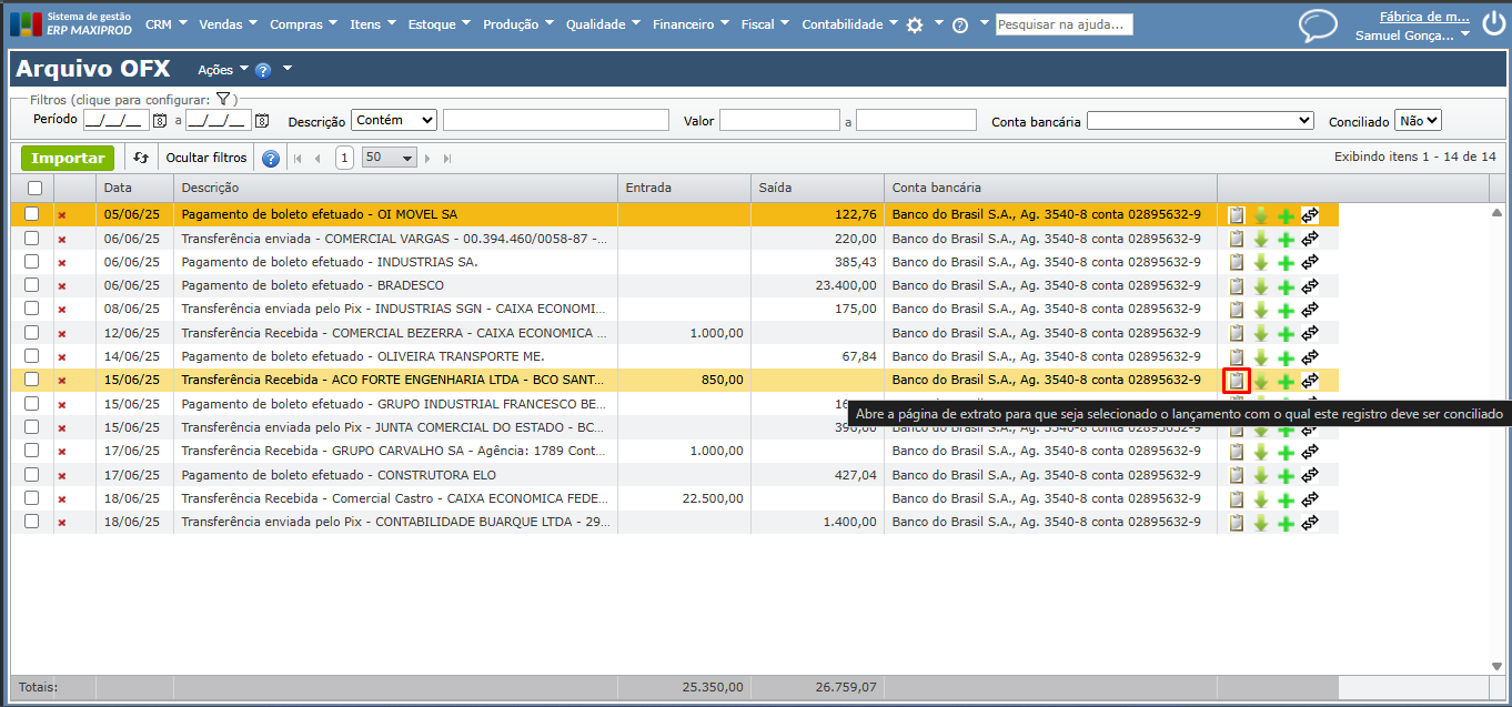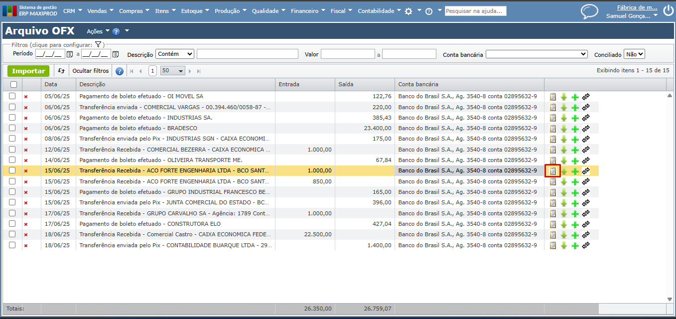 2) Em seguida, localize os registros correspondentes ao título no qual foram feitas as baixas parciais. Clique no ícone da prancheta para conciliar com os lançamentos presentes no extrato.