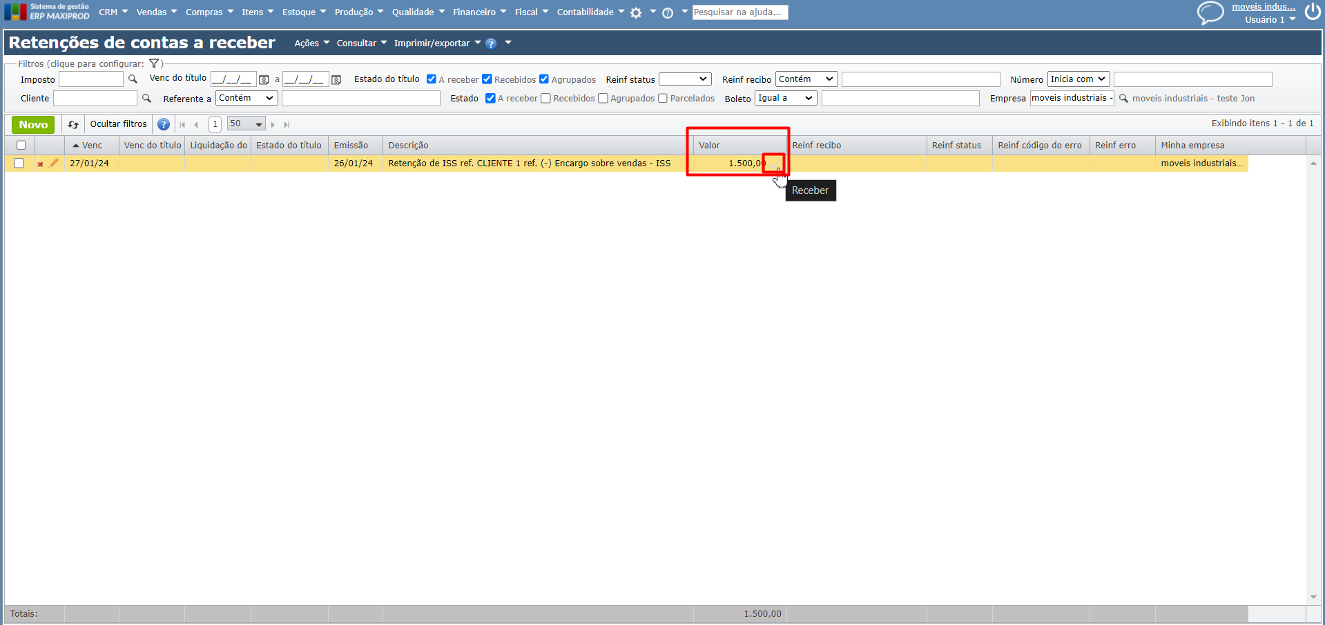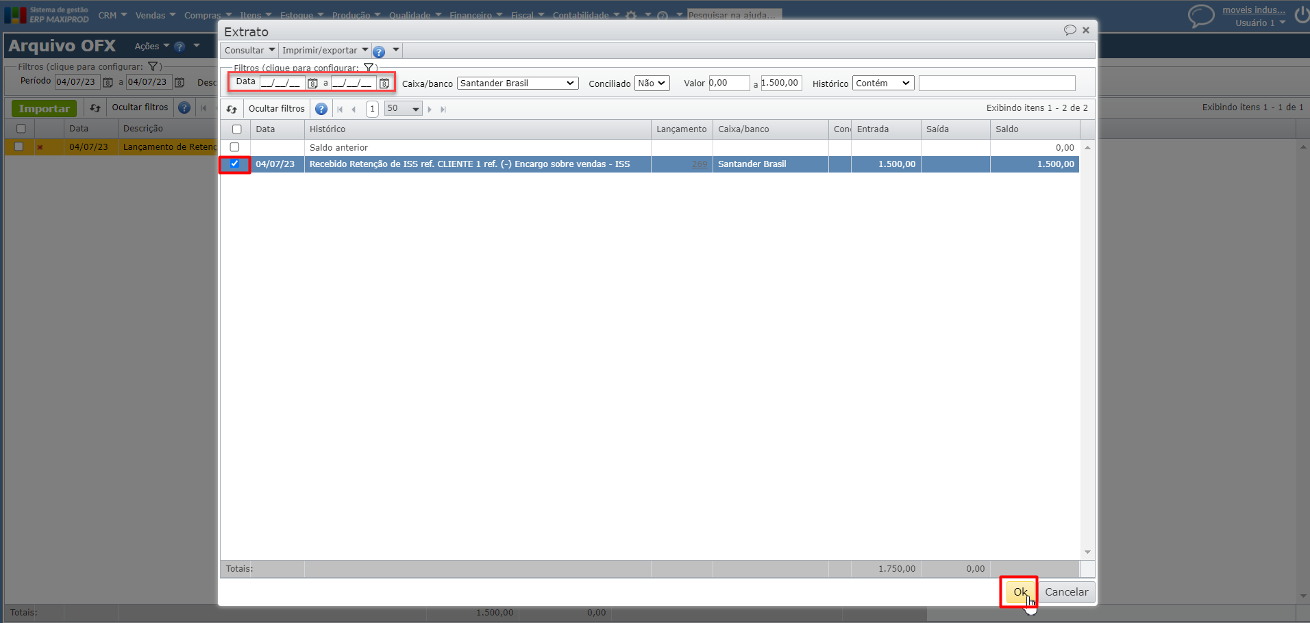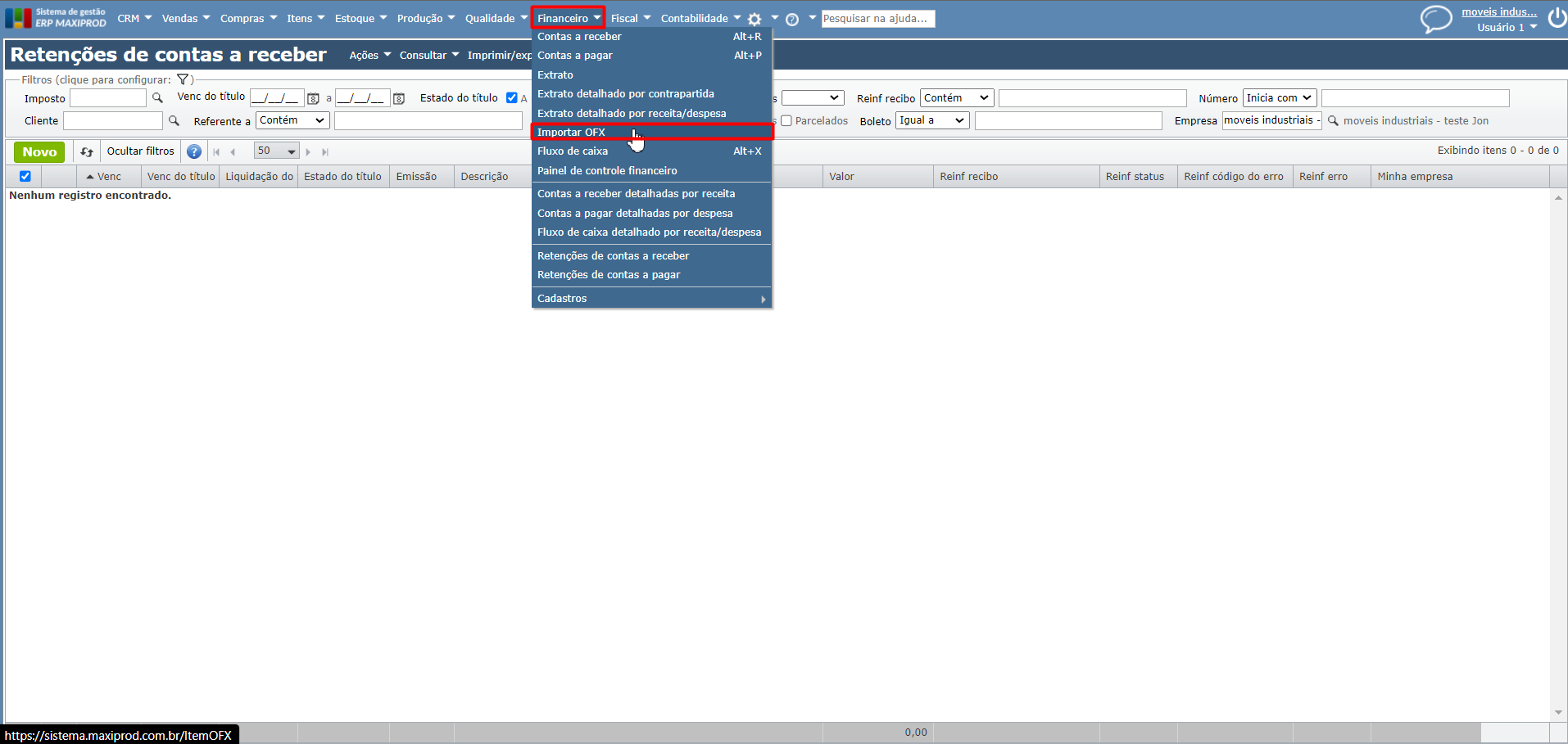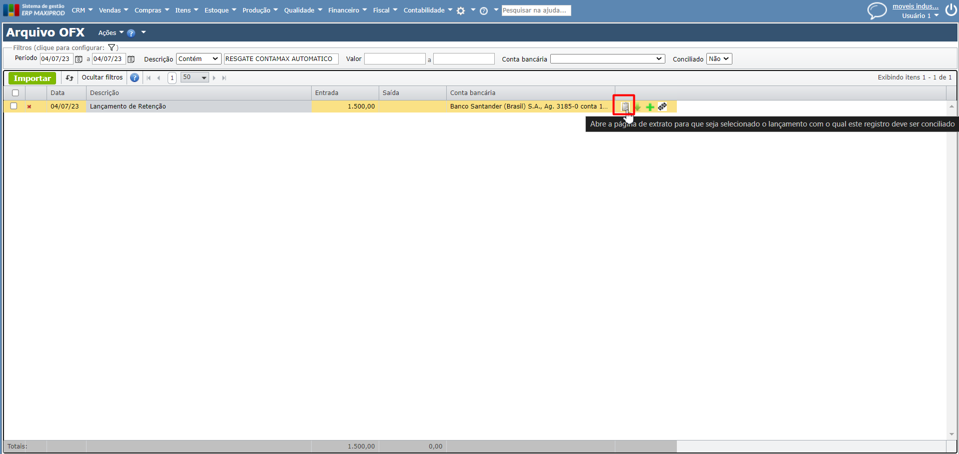 O sistema ERP MAXIPROD permite a conciliação de registros de arquivo OFX com títulos de retenções a pagar/receber. Para isso, é necessário baixar (receber ou pagar) o título referente à retenção e fazer manualmente a conciliação entre o registro do OFX e o lançamento da baixa do título. Veja a seguir como realizar este procedimento.