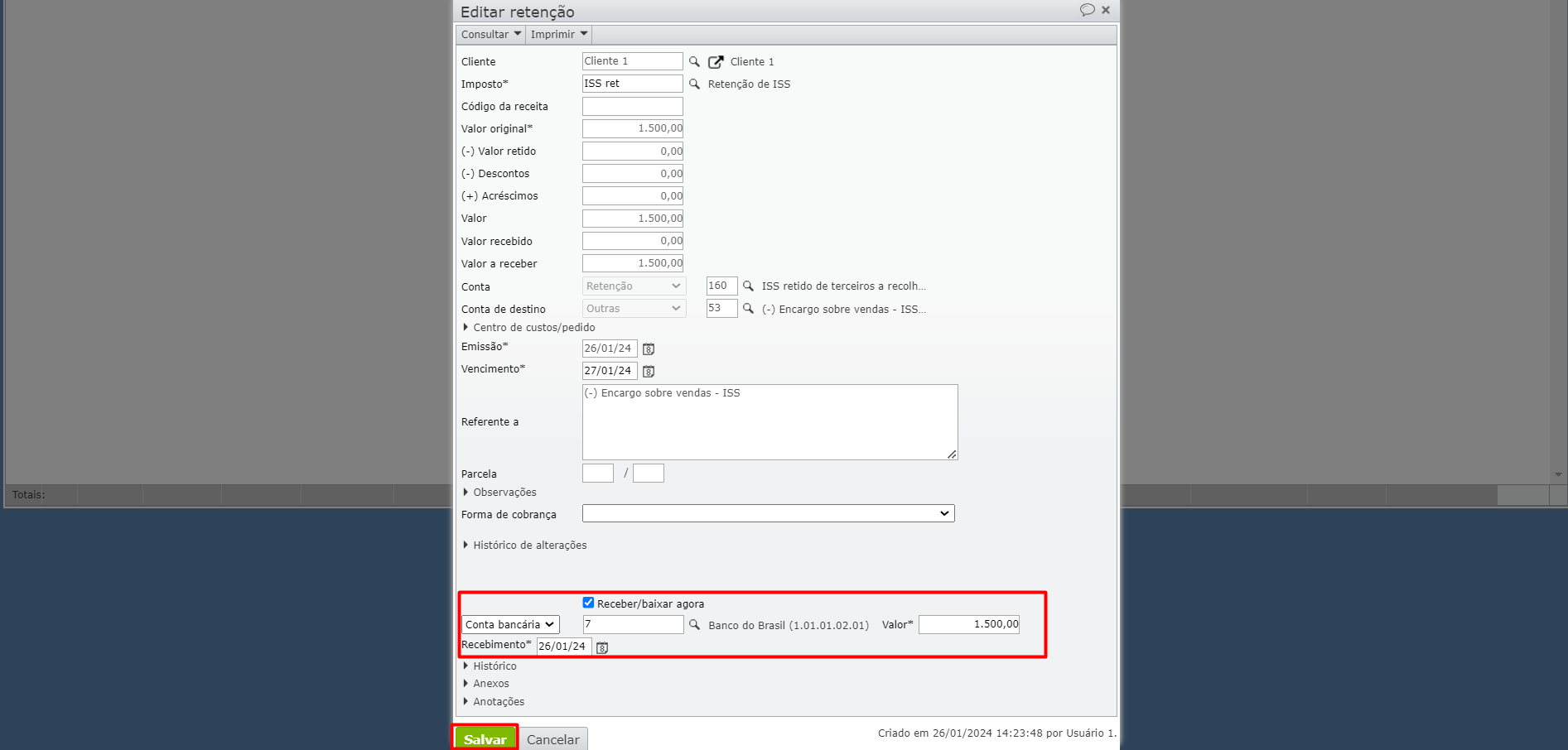 3) Será aberta a tela de edição do título com a opção “Pagar ou Receber/baixar agora” selecionada. Informe a conta bancária (conta contábil correspondente à conta bancária do OFX), no campo destinado à data de recebimento/pagamento informe a mesma data do registro no OFX. Agora, clique no botão verde “Salvar” e o título será baixado.