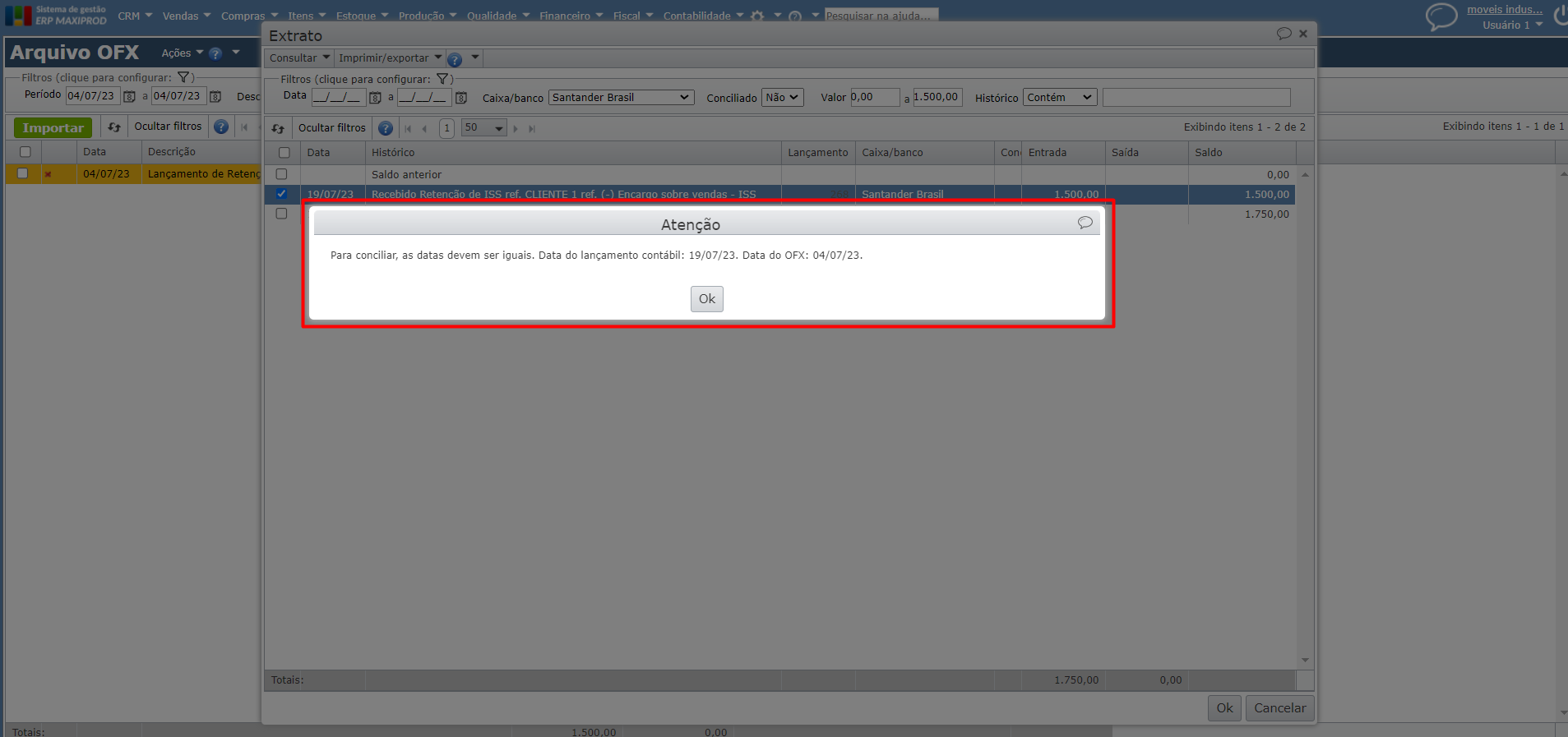 b) Se o título foi baixado com uma data diferente do lançamento no OFX, a seguinte mensagem será exibida, não permitindo a conciliação. Neste caso é necessário voltar no título, desfazer baixa e refazer com a data correta.