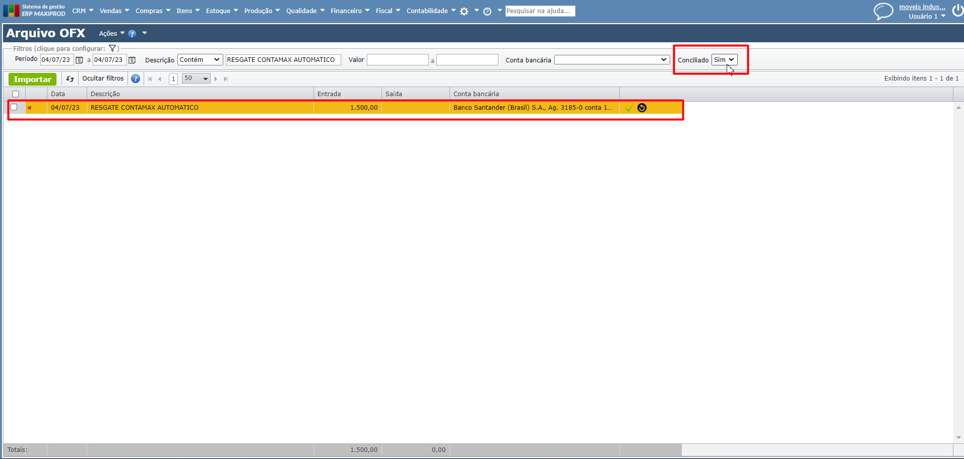 7) Agora, a conciliação será realizada, e o registro conciliado pode ser visualizado selecionando “Sim” no filtro “Conciliado”. Veja como desfazer a conciliação do registro clicando aqui.