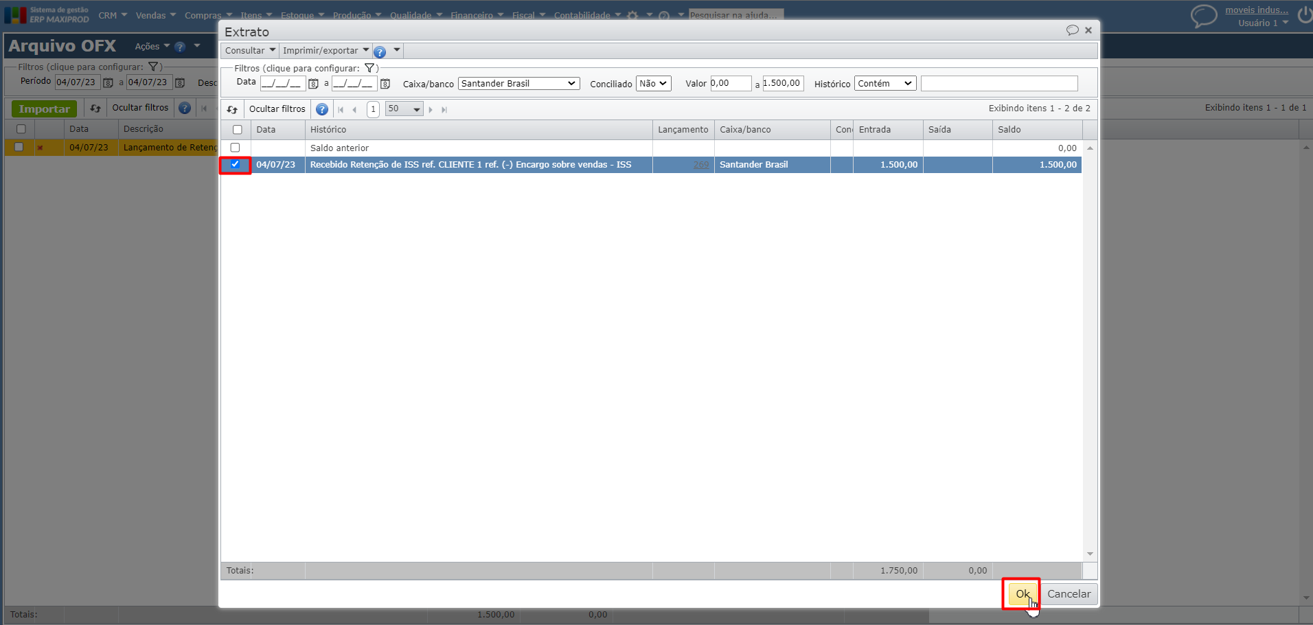 6) Na tela “Extrato”, selecione o lançamento referente à baixa (recebimento ou pagamento) do título e clique no botão cinza “Ok”.
