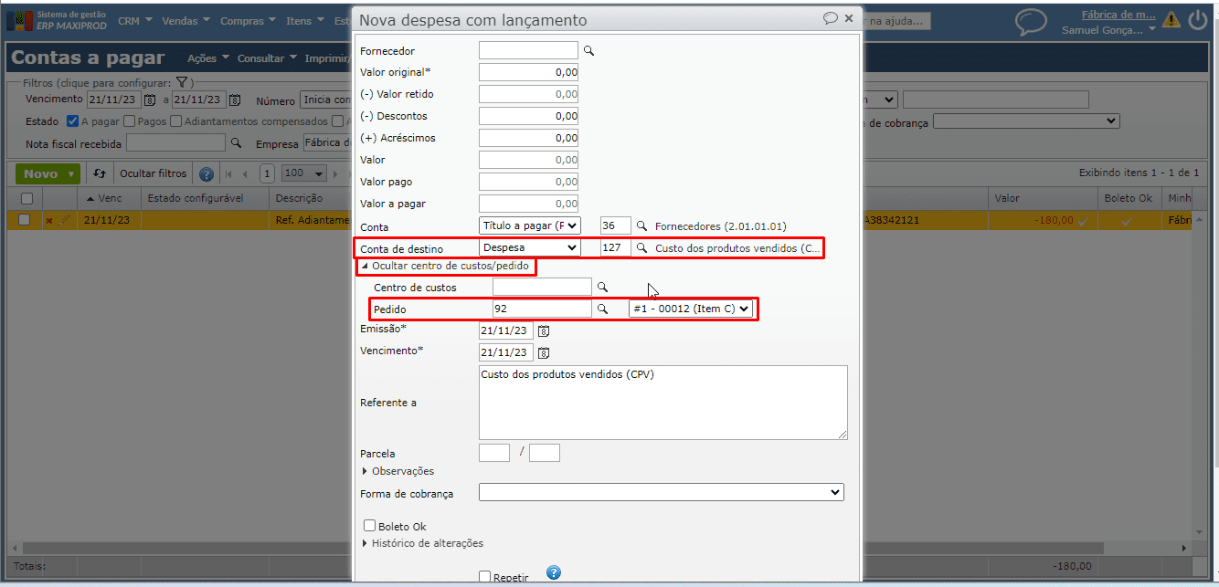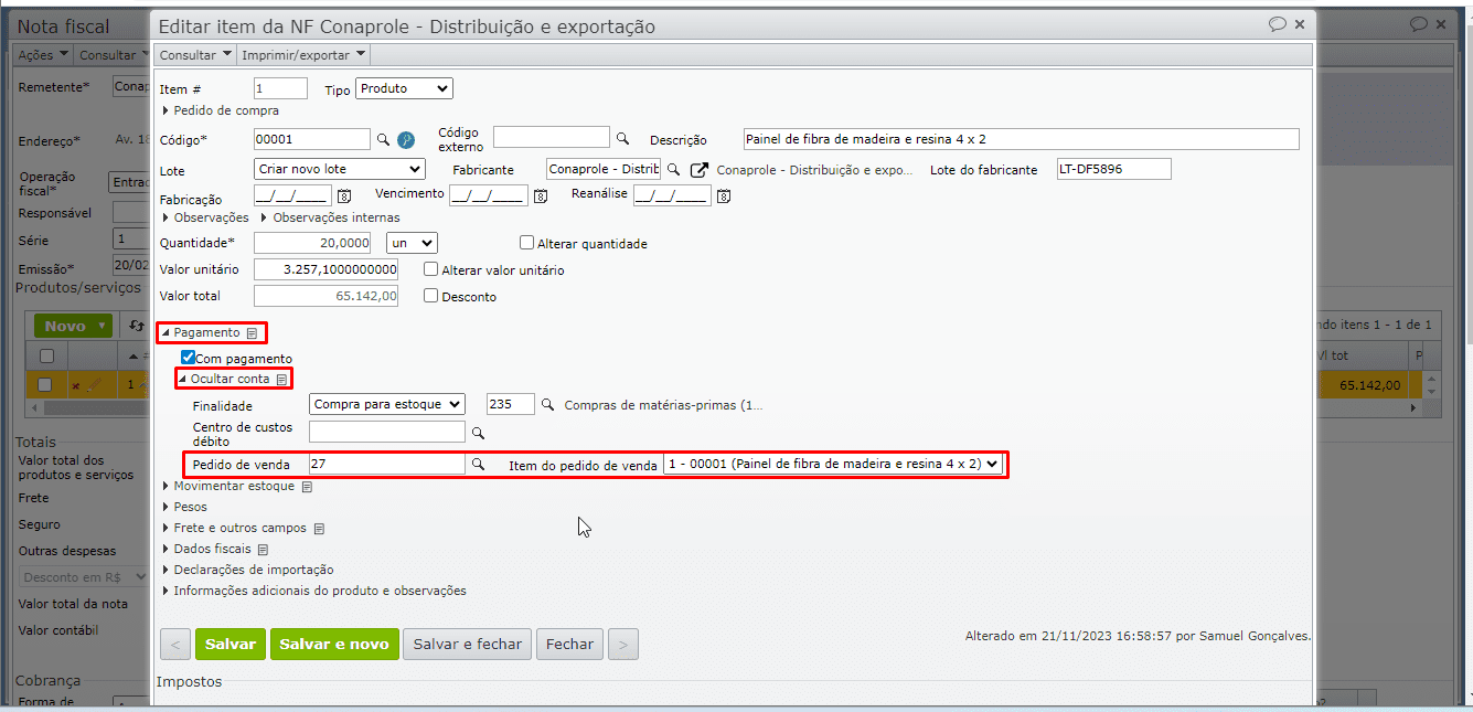 b) Na tela de “Contas a pagar detalhadas por despesa” de títulos originados de nota fiscal de entrada, o campo “Item do pedido de venda” é preenchido com o item do pedido de venda informado na aba “Conta” da seção “Pagamento” da edição do item, se houver.