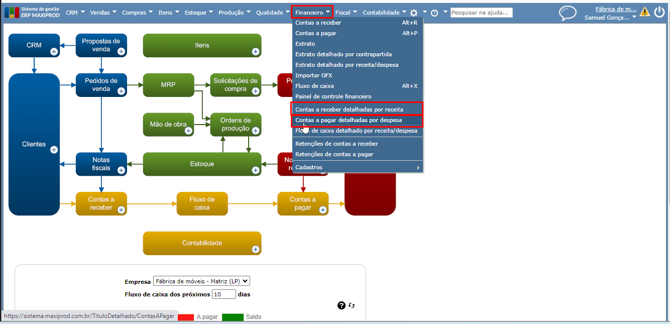 3) Para contas a receber/pagar do tipo “Título”, ou seja, criadas pela emissão ou recebimento de NF, a coluna “Item do pedido de venda” é preenchida somente nas telas de “Contas a receber detalhadas por receita” e “Contas a pagar detalhadas por despesa”. Ambas são acessíveis pelo menu superior “Financeiro”.