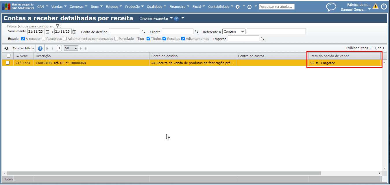 a) Na tela de “Contas a receber detalhadas por receita” de títulos originados de nota fiscal, o campo “Item do pedido de venda” é preenchido com o item do pedido de venda do vínculo do item da nota fiscal, se houver.